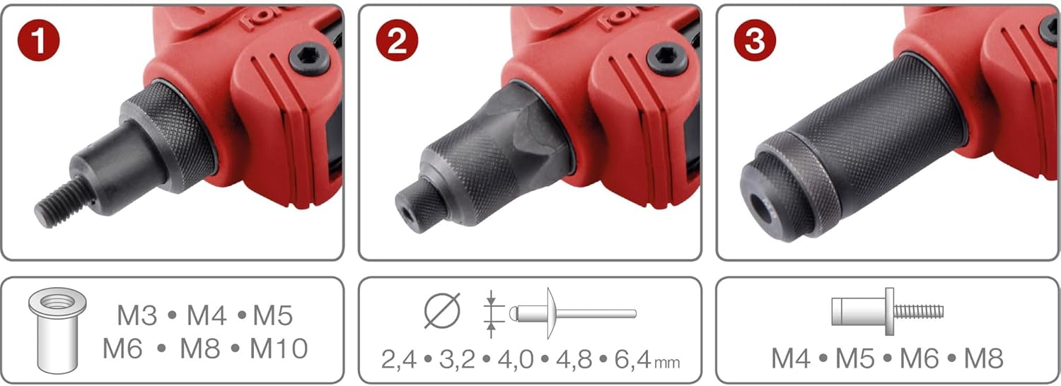 | Included Components | Riveting pliers, tension mandrels for rivet nuts and blind rivet screws including coloured storage system, tension jaws for pop rivets, transport case |