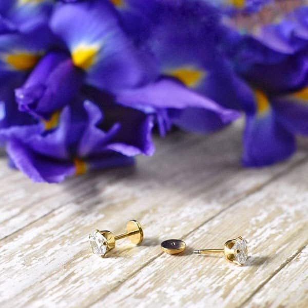 This style makes comfort even more beautiful! Look stunning, both day and night, in these sparkling 6.00mm crystal gems … set in 5-prong studs … plated in luxurious, real 14K gold! These earrings will instantly dress up any outfit. Safe and comfortable for even the most sensitive ears. All our styles are made with medical-grade 316L stainless surgical steel. To plate the steel, we use Physical Vapor disposition. Although complicated, jewelry experts agree PVD coating is one of the best plating methods available. Designed with the post fixed to the top. Simply insert from the front and the Comfy flat backs screw onto the post behind the ear.