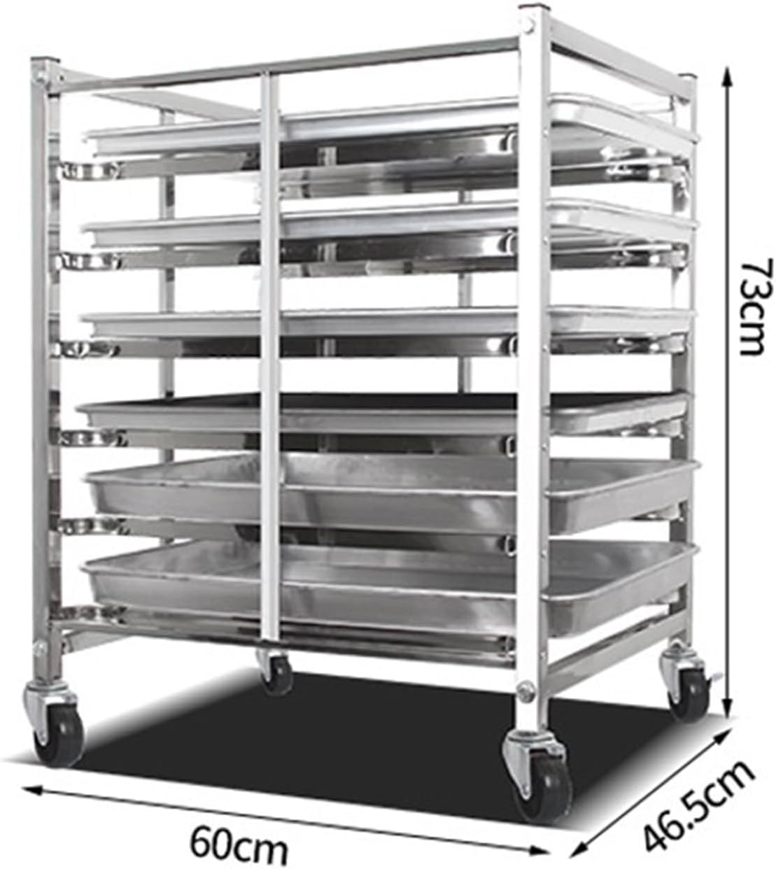 This versatile stainless steel bread rack is an essential addition to any kitchen, whether in a bustling restaurant, a cozy bakery, or your own home. Designed for efficiency, this multi-layer rack can store and cool a variety of baked goods, accommodating both full-size and half-size pans. Its compact design maximizes your available space, making it ideal for busy environments where organization is key. Crafted from high-quality stainless steel, this bread rack boasts a load capacity of 75 lbs per layer, ensuring it can handle your heaviest baking needs. With dimensions available in 6-layer (60*46.5*73cm), 12-layer (60*46*134cm), and 15-layer (60*46*164cm), you can choose the perfect size to fit your space. The polished edges are designed for safety, protecting your hands while you work. The thoughtful design includes a generous 3-inch spacing between layers, promoting excellent air circulation for faster cooling of your baked goods. Ideal for bakeries, cafeterias, and commercial kitchens, this rack also shines in home kitchens, making it easier to prepare large quantities of food. Mobility is a key feature, as the rack is equipped with four universal casters, two of which have brakes for stability. Easily move it around your kitchen or workspace, ensuring that it's always where you need it most. Whether you’re a professional baker or a home cooking enthusiast, this stainless steel bread rack helps streamline your baking process, making it a valuable investment for anyone who loves to bake.