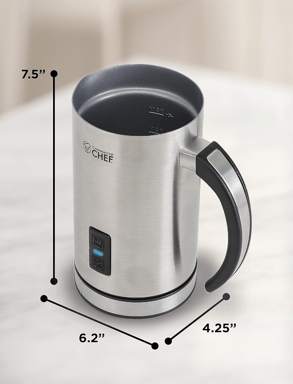 Our Commercial Chef cordless milk frother & heater perfectly froths and heats milk at the touch of a button. Considered one of the top kitchen accessories for coffee drink lovers, this cordless frother pairs well with any cappuccino machine, coffee maker, and espresso maker. With dimensions of 6.2” x 4.25” x 7.5" and a weight of 2.07 lbs., the exterior of our coffee frother is brushed stainless steel finish with a non-stick coated interior, which makes for easy cleaning. Truly, this electric milk frother is known as one of the best coffee bar essentials and espresso machine accessories on the market today. This milk frothing pitcher has a 1 cup capacity for heating milk, 1/2 cup capacity for frothing milk (115 ml for milk foaming and 240 ml for milk warming). This frother for coffee heats milk to approximately 149˚F/65˚C. It also has a detachable power base with non-slip silicone feet and a 360˚ strain relief power cord connector, including a transparent lid as well as a silicone ring. Our electric frother includes a standard whisk and even a frothing whisk. This device entails an automatic shutoff feature. Enjoy frothy milk with our Commercial Chef handheld cordless frother any time of day.