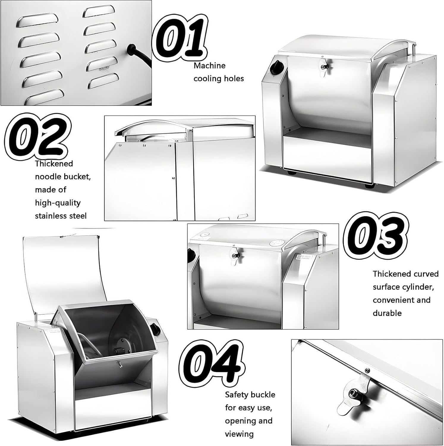 Experience effortless dough preparation with our Commercial Dough Maker, an essential electric dough mixer designed for both home and professional kitchens. This powerful machine, crafted from food-grade stainless steel, combines durability and efficiency, making it perfect for a variety of baking needs. With a robust power output of 1500W, our dough-kneading machine can handle noodle volumes of 5 to 8 kg of flour, ensuring you can create large batches of dough with ease. Whether you're preparing fresh pasta, bread, or pizza dough, this machine simplifies the kneading process, allowing you to focus on perfecting your recipes. The built-in timing function allows you to customize kneading times to achieve the desired dough consistency, providing flexibility for different types of culinary creations. Its spacious noodle bucket, measuring 30*25.5*32 cm, is designed to accommodate significant amounts of dough, making it ideal for busy kitchens or catering services. Measuring 48*32*45 cm and weighing 25 kg, this dough mixer is sturdy yet compact enough to fit into most kitchen spaces without compromising on performance. The sleek design not only enhances your kitchen's aesthetics but also ensures easy cleaning and maintenance. Safety is paramount; therefore, please remember to avoid placing your hands into the noodle bucket during operation. Elevate your cooking experience with our Commercial Dough Maker, and enjoy the convenience of professional-grade dough preparation in the comfort of your own kitchen.
