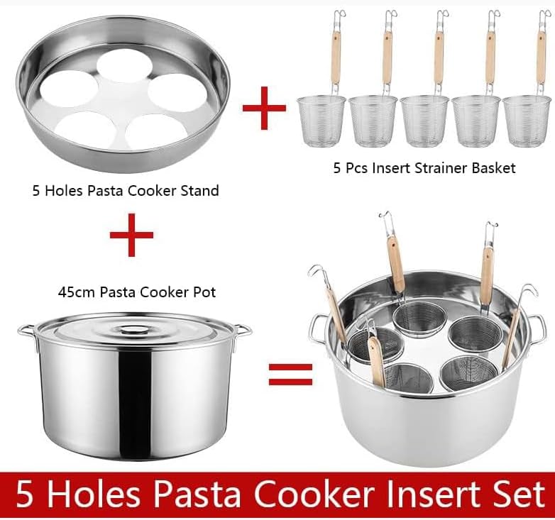Product Description This family-size Pasta Cooker/Steamer Set makes cooking and draining pasta easy. With Inserts strainer basket, dinner has never been easier. Includes a hangable steel lid for healthier, steam cooking. Pasta Cooker Insert Set With Divider And Colander Strainer Material: 201 Stainless Steel Color: Silver Size: 3 Hole Pasta Cooker Pot Size: 22x36.5cm/8.7x14.4 inches 4 Hole Pasta Cooker Pot Size: 23x41.5cm/9x16.4 inches 5 Hole Pasta Cooker Pot Size: 24x46.5cm/9.4x18.3 inches Insert Strainer Basket Size: 14x14.5x21.5cm/5.5x5.7x8.5 inches Suitable: Induction Cooktop, Gas, Electric, Ceramic Cooktops Package List: 1 x Pasta Cooker Pot 1 x Pasta Pot Stand 1 x Pasta Cooker Pot Lid 3/4/5 x Insert Strainer Basket