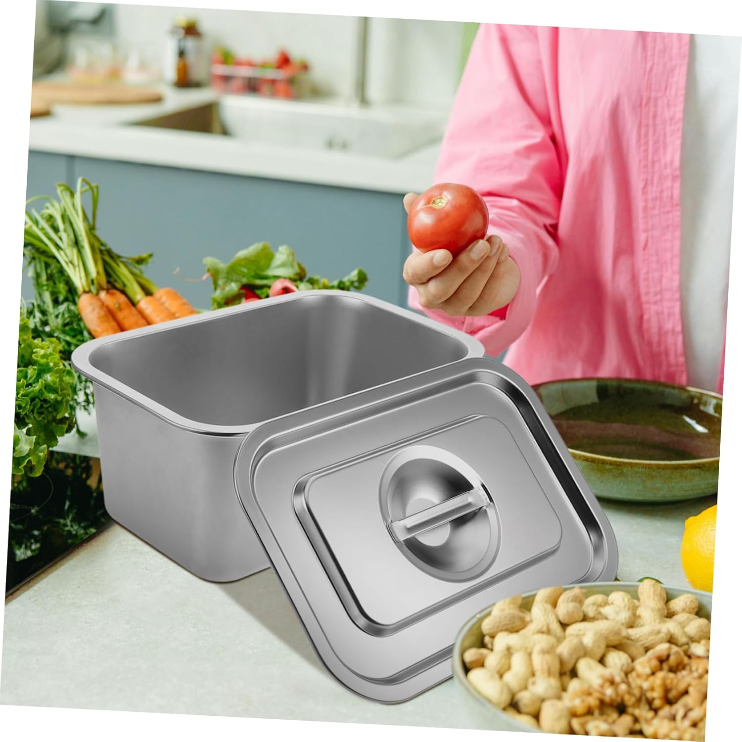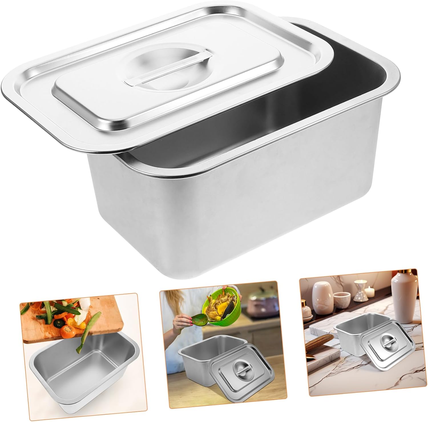 Package Include 1 x Storage basin 1 x Lid Characteristics -Firm material: crafted from firm stainless steel, this kitchen storage bin with lid is designed to withstand daily use and resist damage compost bucket with lid for kitchen -Color:Silver compost bin -Size:32.00X22.00X15.00cm/12.58X8.65X5.89in compost pail -Secure lid: the storage bin features a lid that helps to contain food scraps and prevent smell from escaping, keeping your kitchen environment pleasant compost bucket -Convenient placement: ideal for placement on your kitchen countertop, this trash bin is always within reach, making it easy to dispose of food waste as you cook stainless steel compost bin -Material:Stainless steel compost container for kitchen -Practical: with a capacity that is just right for everyday use, this food composter for kitchen holds a substantial amount of food scraps without taking up excessive space food scrap bin -Supports waste management: encourages the separation of food waste from other trash, aiding in waste management and composting efforts kitchen compost bin countertopGoods Descriptionstorage bins with lids for kitchen Keep your kitchen tidy and with this practical composting .compost bin Transform your kitchen waste into valuable compost with this countertop compost bin.composting bin kitchen The lid is easy to open and close, allowing you to quickly dispose of food scraps without any hassle.small compost bin Its compact design makes it ideal for small kitchens, while the stainless steel construction allows it is both sturdy and stylish