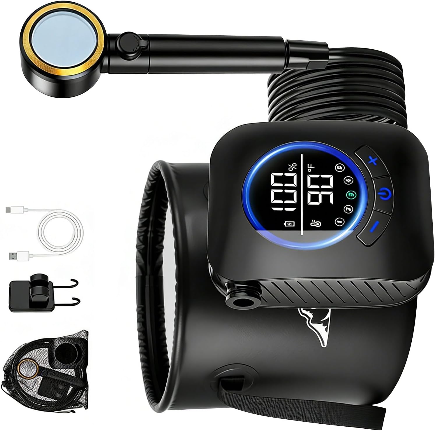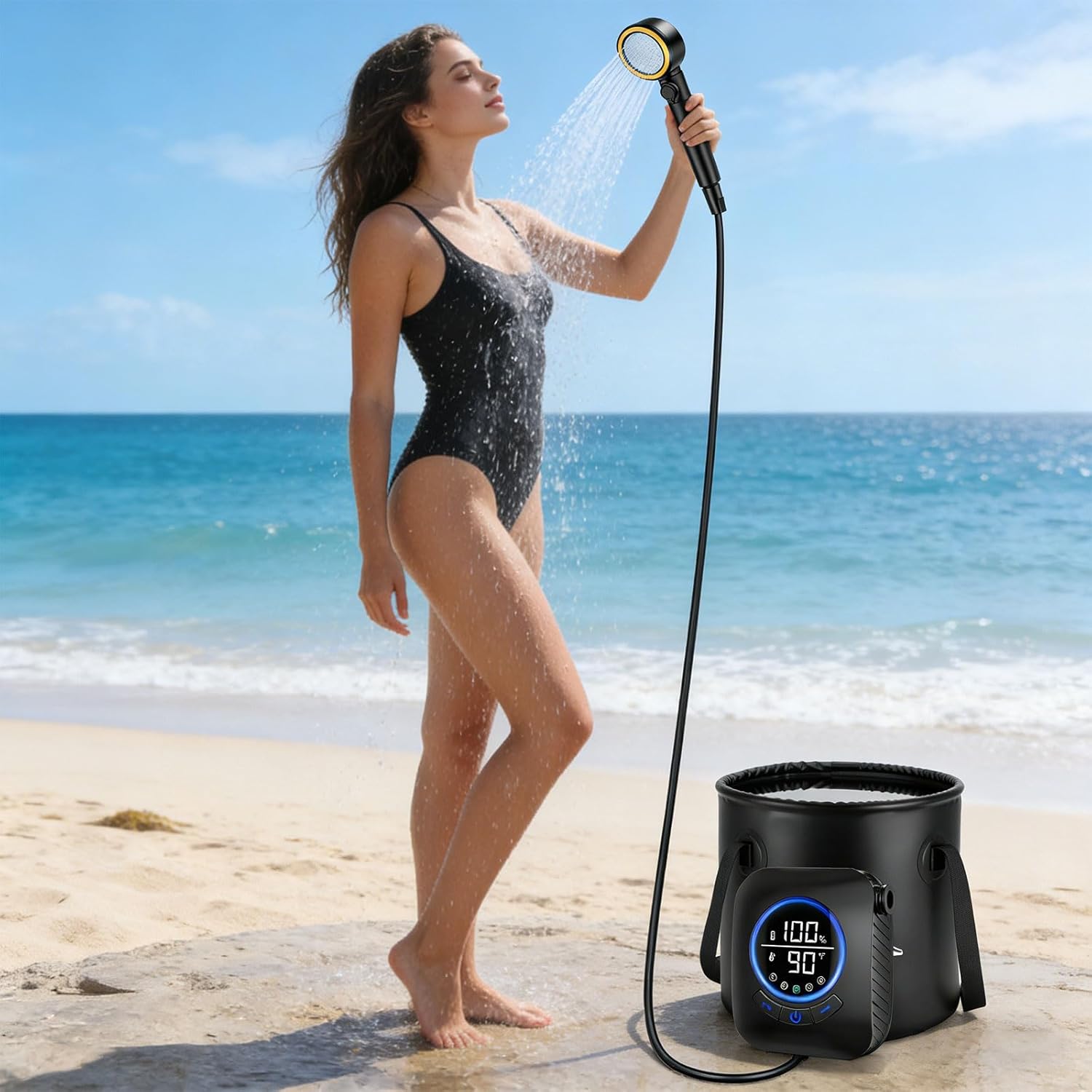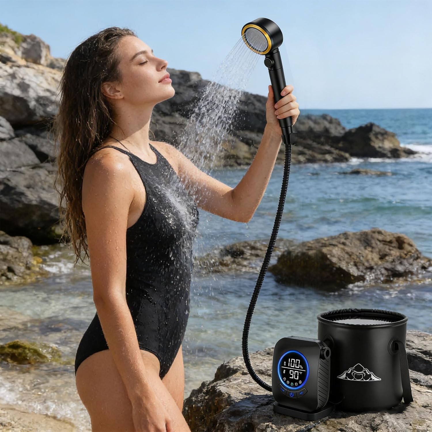 Compact Rechargeable Camping Shower With 20L Foldable Container And Multiple Water Settings Features: Long lasting rechargeable battery: This portable shower features an upgraded 18650mAH battery providing 180 minutes of continuous With versatile charging associations including mobile devices Smart digital display ( temperature scale): The LED screen monitors remaining fee and water temperature ( 50 122°F) Color indicators show optimal ranges ( green: 95 113°F; blue: below 95°F; red: over 113°F) for safe usage during beach trips or pet washing Note: denial heating capability included Five adjustable pressure settings: Choose from five water intensity picks with strongest output 6 liters per 60 seconds for profound or softer 3 liters per 60 seconds lasting 3 hours 20L portable water reservoir: Made from heavy duty 500D fabric with reinforced edges ( 10.23 " x11.81 "), this storage unit maintains shape when holding liquid Folds compactly for transportation and pairs perfectly with the shower unit Four water modes & versatile mounting: Alternate between shower functions, focused stream, or tool by adjusting the nozzle Includes multiple hanging preferences / sticky mattresses for secure placement on tents, trees Specifications: Product size: Battery: 9.5x12x4.5 Pipe 2 meters drum: Diameter 25 Height 30 Net weight: 924g potential 3.7V Battery: 18650mAH Power: 90W Usage scenarios: Hiking, cars, pets, beaches Package Includes: 1 set of portable camping showerx1 Note: Before using the accessory, please check it is compatible Pay attention to the storage methods