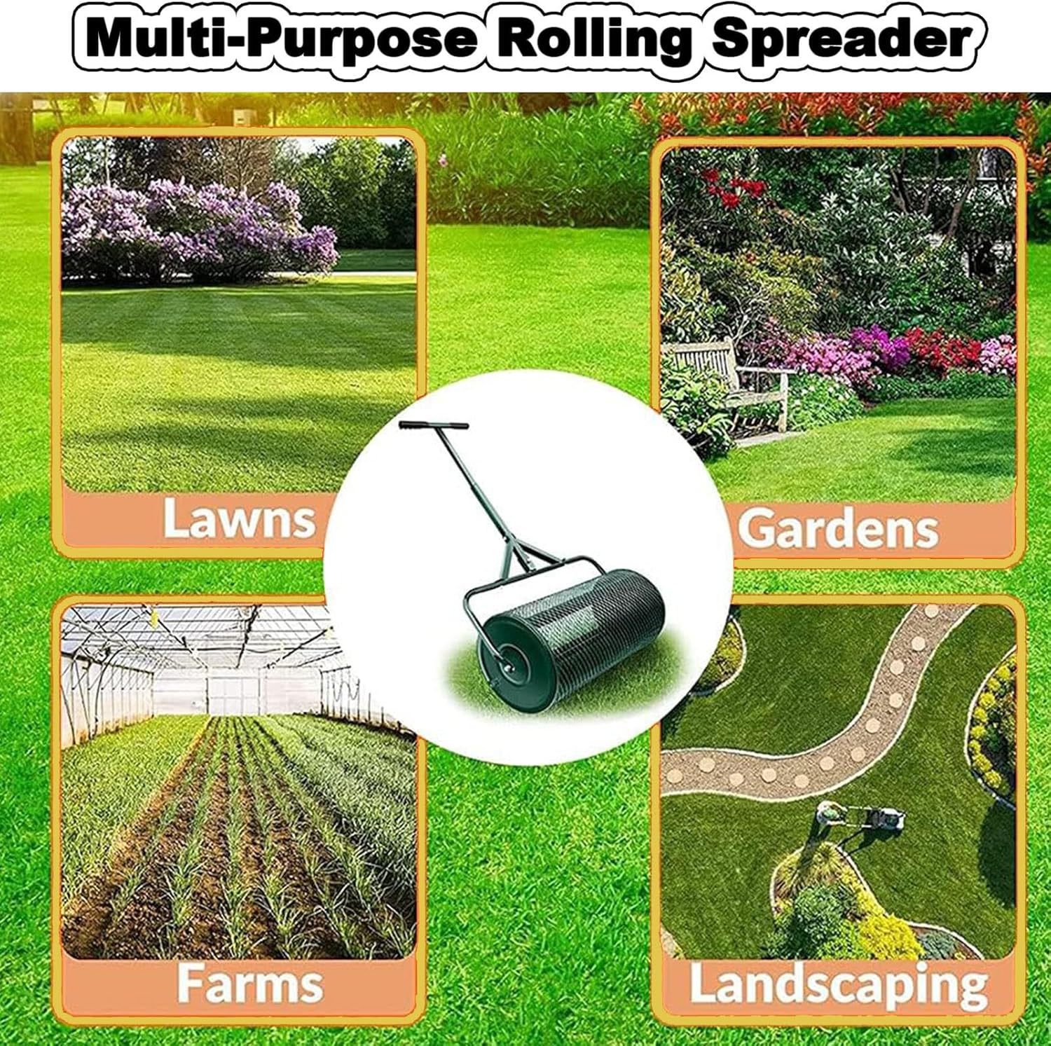 Let's walk towards our dream lawn together. Spreader is a user friendly lawn roller that makes the topdressing job so much easier, a must-have for anyone trying to take good care of the lawn. It is heavy duty but light weight. This all steel roller can spread any fine topdressing material such as peat moss, compost, manure, and topsoil. The cylinder mesh drum has diamond-shaped 1/2-inch by 3/4-inch openings. It breaks up clumpy materials as it tumbles, leaving behind any unwanted large residuals in the drum for disposal. The hinged door swings open for easy loading and is secured with two heavy duty hitch pins when closed. The handle can be adjusted from 23\u201d to 31\u201d in length to suit the user so that you will be comfortably pushing or pulling whether you are tall or short./>/>Specification:/>Product name: Multi purpose seed spreader/>Material: Sturdy stainless steel/>Color: Black/Green/>Spreader Size: 24" L x 12.5" H/>Product weight: 8.9 kg/>/>Features:/>24" Heavy-Duty Rolling Barrel/>Extra Thick 3/4" Heavy-Duty Steel Mesh/>Wide Spread Radius for Even Distribution of Topdressing/>Double-Locking Side Clasps Stay Secure as You Roll/>Comfort-Grip Handle for Longer Spreading/>Easy No Tool, One-Click Assembly/>, Long-Lasting Construction/>/>Package Contents:/>1 x Spreaders for lawns/>/>After-sales Service:/>Your satisfaction is our top priority, If you have any problems with the Spreaders for lawns you bought. Our team will provide you with the perfect solution within 24 hours.
