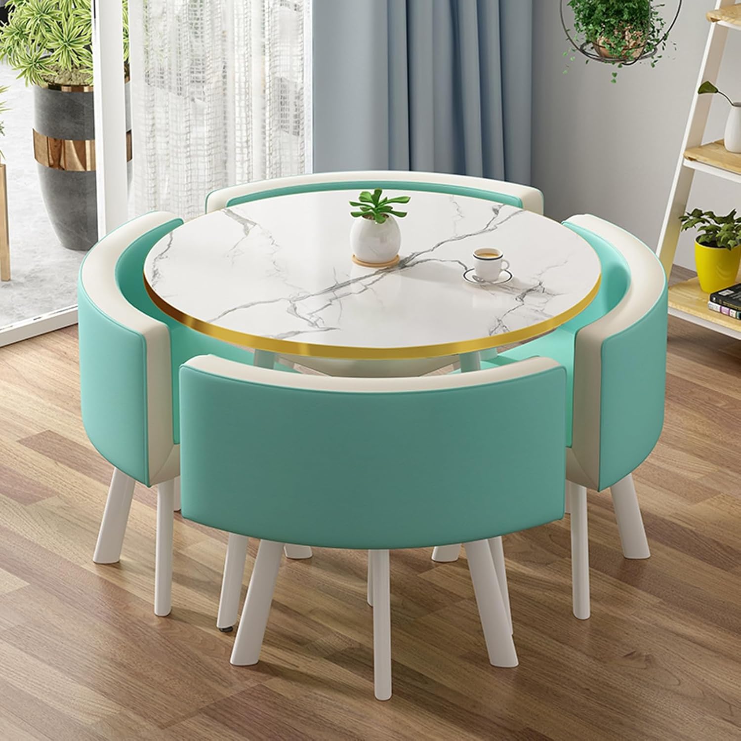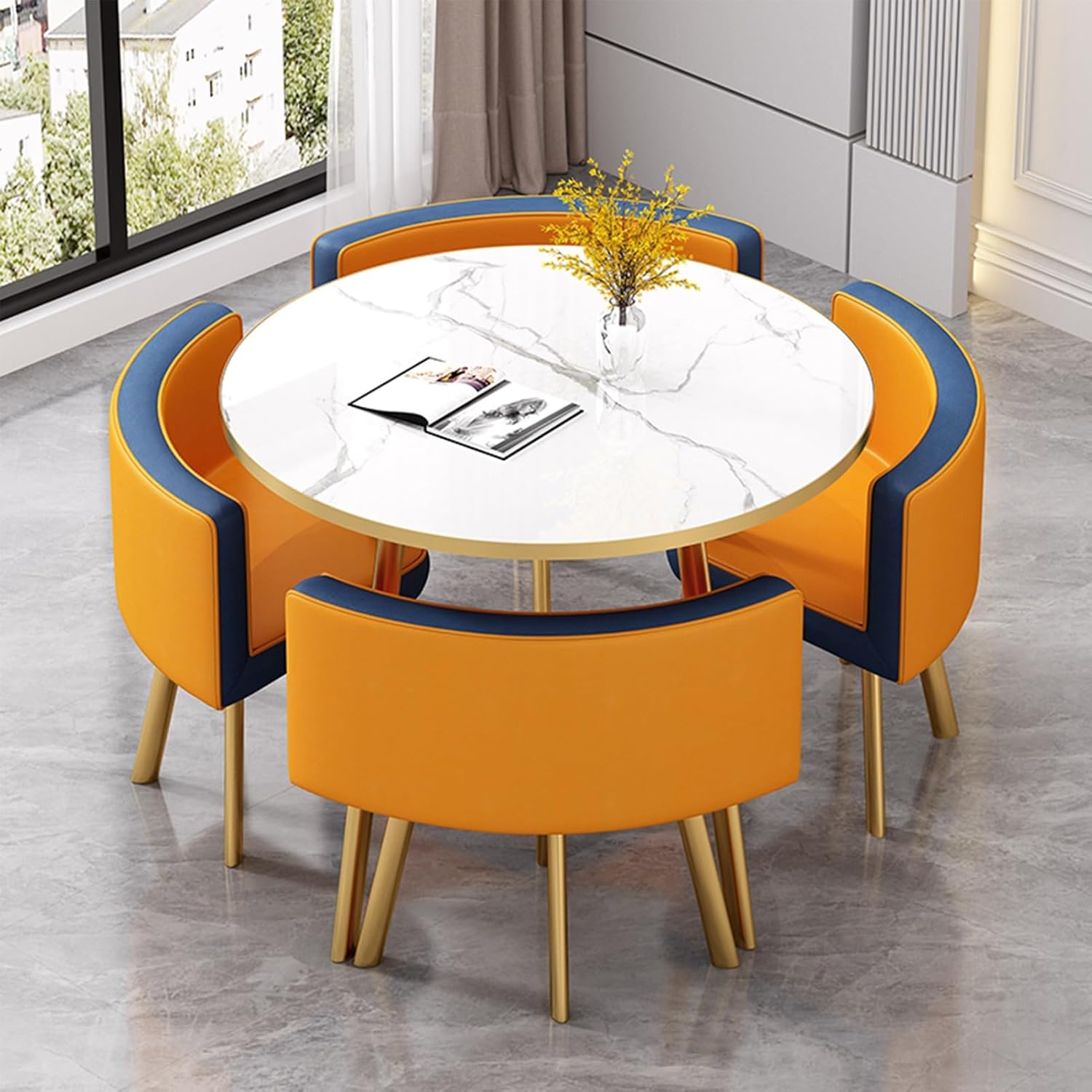 HOLGVE Coffee Shop Leisure Table and Chair Combination,at Office Reception Room, this Office Table and Chair Set can also be used as a small dining table in the kitchen or as a small conference table in the office.Features: simple and elegant, saving spaceStyle: simple and modernBracket structure material: ironMesa shape: roundDesktop material: High-density environmentally friendly panelsSeat Cushion Material: High quality leatherTable top diameter: 80 cm/31.4 inchesApplicable scenarios: coffee shop, living room, kitchen, terrace, restaurant, lounge, reception room, office, outdoor, milk tea shop, bakery, hotel, negotiation room, bar, etc.Applicable number of people: 4 peoplePacking method: AssembledPacking list: 1*table, 4*chairsNotice:1. The product size is similar, there is an error of 1-2cm, the actual size shall prevail.2. Due to light, angle, monitor and other reasons, there may be a certain color difference. All products are subject to the actual product.