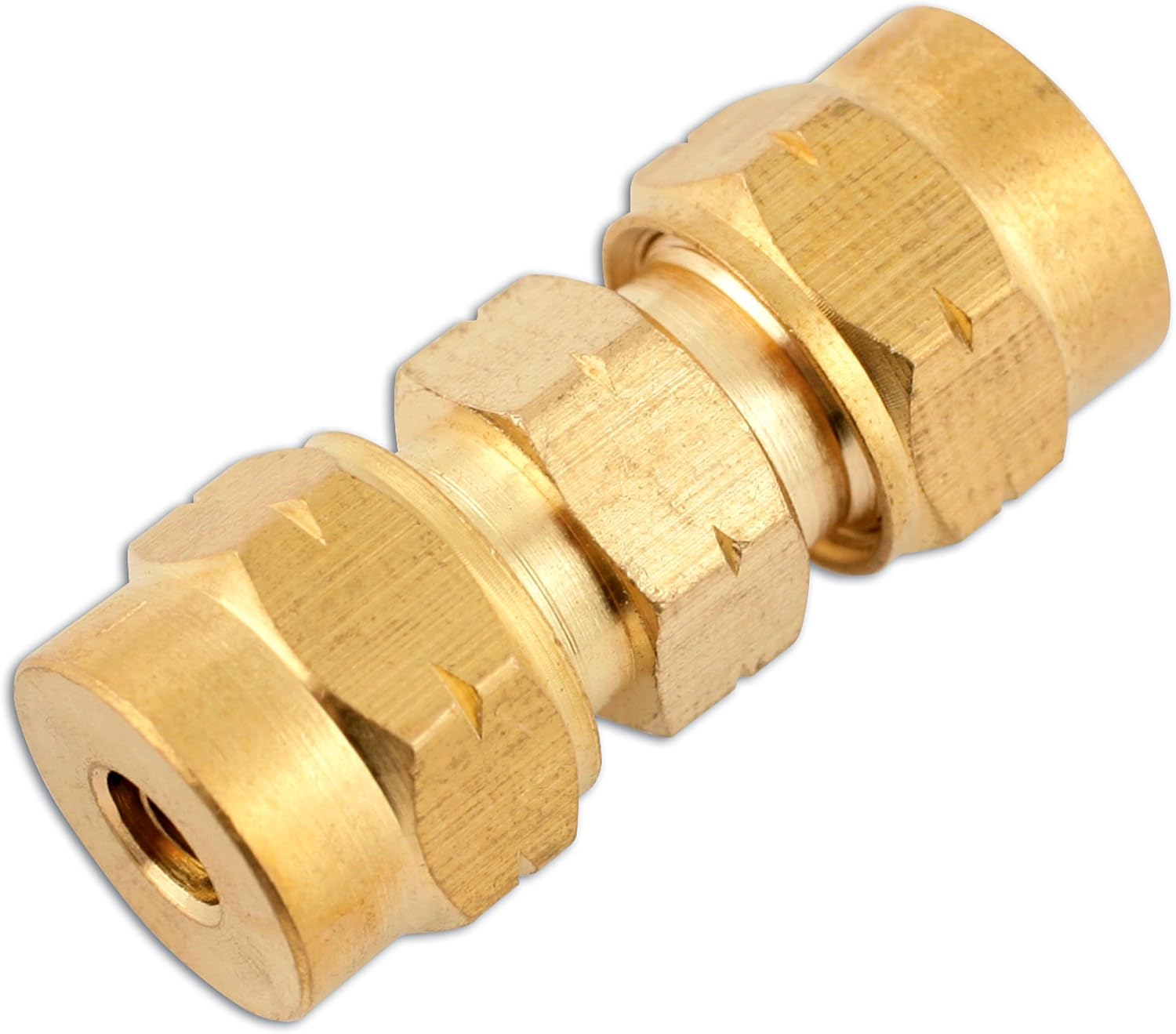 Brass compression fitting, suitable for use in fluid control systems.