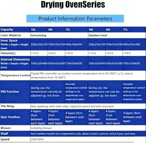 Introducing the Industrial-Lab Digital Convection Oven, designed for precision drying and heating across various applications such as laboratories, medical facilities, electronics manufacturing, and agriculture. This advanced oven is equipped with PID control, allowing you to set temperatures between 50°C and 280°C for optimal performance. With adjustable airflow and uniform hot-air circulation, it enhances productivity by ensuring rapid processing while maintaining consistent quality. **Key Features:** - **Smart Temperature Control:** The microcomputer intelligent temperature controller with PID functionality simplifies operation, making it suitable for both experienced users and beginners. - **Safety Measures:** Equipped with an overtemperature alarm, self-optimization function, and temperature calibration, you can work with confidence knowing that safety is prioritized. - **Durable Construction:** The high-quality stainless steel electric heating tube is designed for long-lasting high-temperature use, ensuring a prolonged lifespan. - **Easy Maintenance:** Removable shelves are included for hassle-free cleaning and replacement, making upkeep straightforward. - **User-Friendly Monitoring:** The large double-layer tempered glass observation window allows for easy monitoring of your processes without compromising the internal environment. **Specifications:** - **Model Options:** - **16 Liters:** Inner dimensions: 25x25x25 cm, Power: 500W, Overall size: 53x43x47 cm, Net weight: 18 kg, with 4 adjustable layers (5 cm apart). - **43 Liters:** Inner dimensions: 35x35x35 cm, Power: 800W, Overall size: 63x53x57 cm, Net weight: 25 kg, with 4 adjustable layers (7 cm apart). - **70 Liters:** Inner dimensions: 45x35x45 cm, Power: 2000W, Overall size: 74x53x68 cm, Net weight: 35 kg, with 4 adjustable layers (9 cm apart). **Packing List:** - 1 Constant Temperature Drying Oven - 2 Separators - 1 Manual Elevate your drying and heating processes with the Industrial-La...