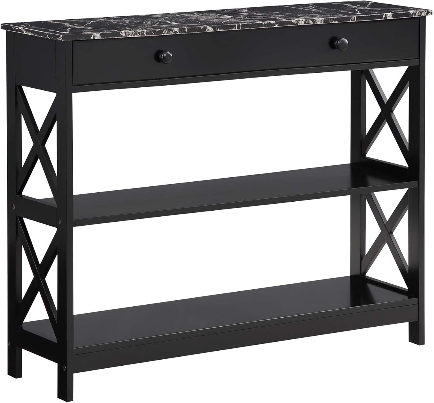 Make your home truly timeless with the Oxford 1 Drawer Console Table with Shelves by Convenience Concepts. This transitional piece features a pull-out drawer on smooth roller slides with two stylish drawer knobs for easy accessibility. The spacious drawer offers plenty of room to stow away entryway essentials and everyday necessities. The X-frame side panels and the three tiers of shelving make this console the perfect decorative piece to display in any room of your home. Beautifully crafted from MDF, non-lead-based paint, and particleboard, this unit is sure to last. This item is sure to last thanks to its easy assembly and maintenance-free design. Add coordinating pieces to your home from the Oxford Collection by Convenience Concepts, each sold separately.