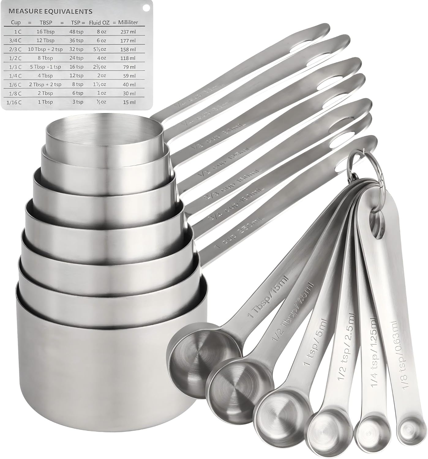 Viwehots copper measuring cups and Spoons set 16 :1.Engraved Us & Metric Measuring Markings - do not fade, wash off or wear out like printed ones 2.Materials: Stainless Steel with copper finish- Rust Proof 3.Round shape to easily stack them into each other for easy storage4.Sturdy Locking Rings to Hold corresponding pieces togetherSet 7 copper Measuring cups set:1/8 cup - 30ml1/4 cup - 60ml 1/3 cup - 80ml 1/2 cup - 125ml 2/3 cup - 160ml3/4 cup - 180ml1 cup - 250ml 6 copper measuring spoons set:1/8 tsp - 0.63ml1/4 tsp - 1.25ml1/2 tsp - 2.5ml1 tsp - 5ml 1/2 tbsp - 7.5ml 1 tbsp - 15ml1 x Measure Equivalents2 X rings Color: CopperCustomer Satisfaction: If there is anything that you are not satisfied with our copper plated measuring cups and spoons set, please contact us freely, we always reply in 24hrs, and we promise to offer our best services for you.
