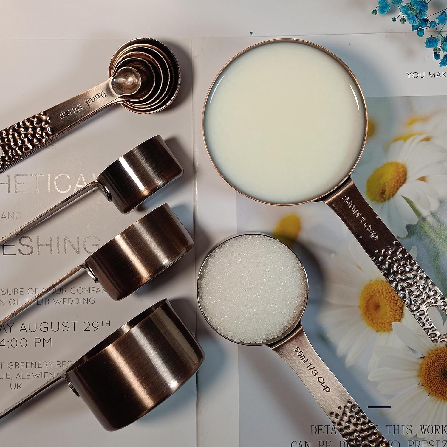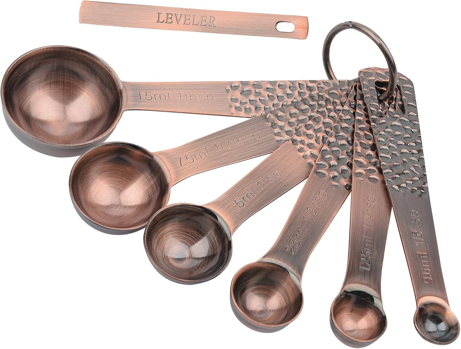 Worried when your plastic measuring cups and spoons are of poor quality, your scales are worn out, or your measurements aren't accurate enough?or your hands are full of spices because the spoon handle isn't long enough?Choose to use Hotsyang STAINLESS STEEL COPPER MEASURING CUPS and SPOONS SET!Why choose our copper measuring cups and spoons set? ✱✱ Endurance&Heavy Stainless Steel:Made stainless steel steel designkeep it sturdy without break case, smooth edge eliminate the concerns of the hand injuredfor Dry and Liquid Ingredients ✱✱ Fit into deep Jars:Our copper measuring cups are long handle cups, makes it easier to get into deep jars.✱✱ Engraved Markings:The size of each metal measuring cups is stamped into the handle so you do not need to worry about the measurement washing off over time ✱✱More Benefits of Hotsyang copper measuring cups and spoons set:-polished stainless steel finish- smooth edges-a metal locking ring- You could hang them -nest together- take up less space-excellent gifts for your family and friendsMeasuring cups and spoons set includes:-1cup. (240 ml)-3/4 cup. (180 ml)-1/2 cup. (120 ml) -1/3 cup. (80 ml)-1/4 cup. (60 ml)-1/8cup. (30 ml)--1/8 tsp. (0.60 ml)-1/4 tsp. (1.25 ml)-1/2 tsp. (2.5 ml)-1 tsp. (5.0 ml)-1/2 tbsp. (7.5 ml)-2/3 tbsp. (10 ml)-1 tbsp. (15 ml)- 2 Locking rings- 1 Leveler These stainless steel measuring cups are great for measuring spice sugar, rice, oil,peanuts, beans, coffee etc. Make your cooking and baking easier and more fun. Customer Satisfaction: If there is anything that you are not satisfied with our copper measuring cups and spoons set, please contact us freely, we always reply in 24 hrs, and we promise to offer our best services for you.