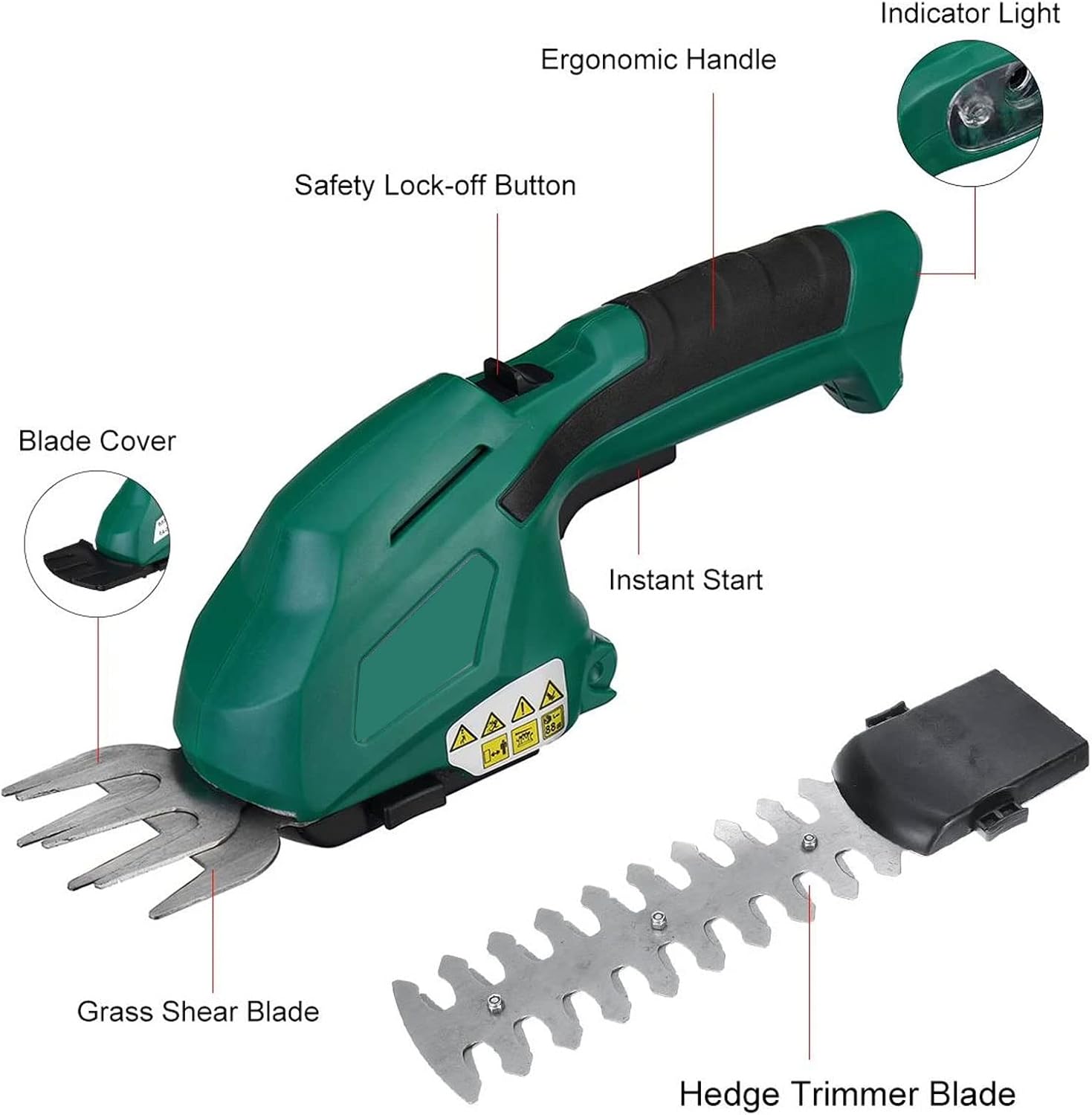 PLEASE PAY ATTENTION: TO PREVENT THE BLADE FROM RUSTING, THE BLADE SURFACE IS COATED WITH ANTI-RUST LUBRICANT,WHICH IS A NORMAL PHENOMENON. YOU'D BETTER WEAR GLOVES WHEN INSTALLING THE BLADE SO AS TO AVOID INJURY AND DIRTY !!! HELPER FOR GARDEN TRIMMING AND MOWING PERFECT FOR POST-MOWING TOUCH UPS IN TIGHT SPACES This Hedge Trimmer and Grass Shear is the best choice for your daily gardening, easy and safe to use. Fast exchange system for hedge trimmer and shearing blade. It is ideal for cutting, trimming, shearing and pruning of garden plants and arbors including hedges, shrubs and small shrubs. MODERN LABOR-SAVING AND TIME-SAVING ELECTRIC TRIMMING VS TRADITIONAL LABOR- AND TIME-CONSUMING MANUAL TRIMMING 1. Real advantage in order to be more free of its movements in the delicate corners to carve 2. No need to plug it in or use gasoline. Just recharge the battery on the mains once discharged 3. Electric grass shear with long battery life 4. Great comfort of use: battery-powered grass shear very light, easy to handle, no more cramps and pains 5. Integrated security key + button: to be removed after each use to avoid all types of accidents 6. Ideal to adapt to your needs: weeds to trim (grass trimmer blades) and sturdier shrub branches (hedge trimmer blade) Portable electric shears will revolutionize your life! The hedge trimmers are so very light, you can now trim your shrubs without worries. Mini cordless hedge trimmer featherweight of about 700 g makes it even more handy and will be very useful for you in delicate places and corners to trim.