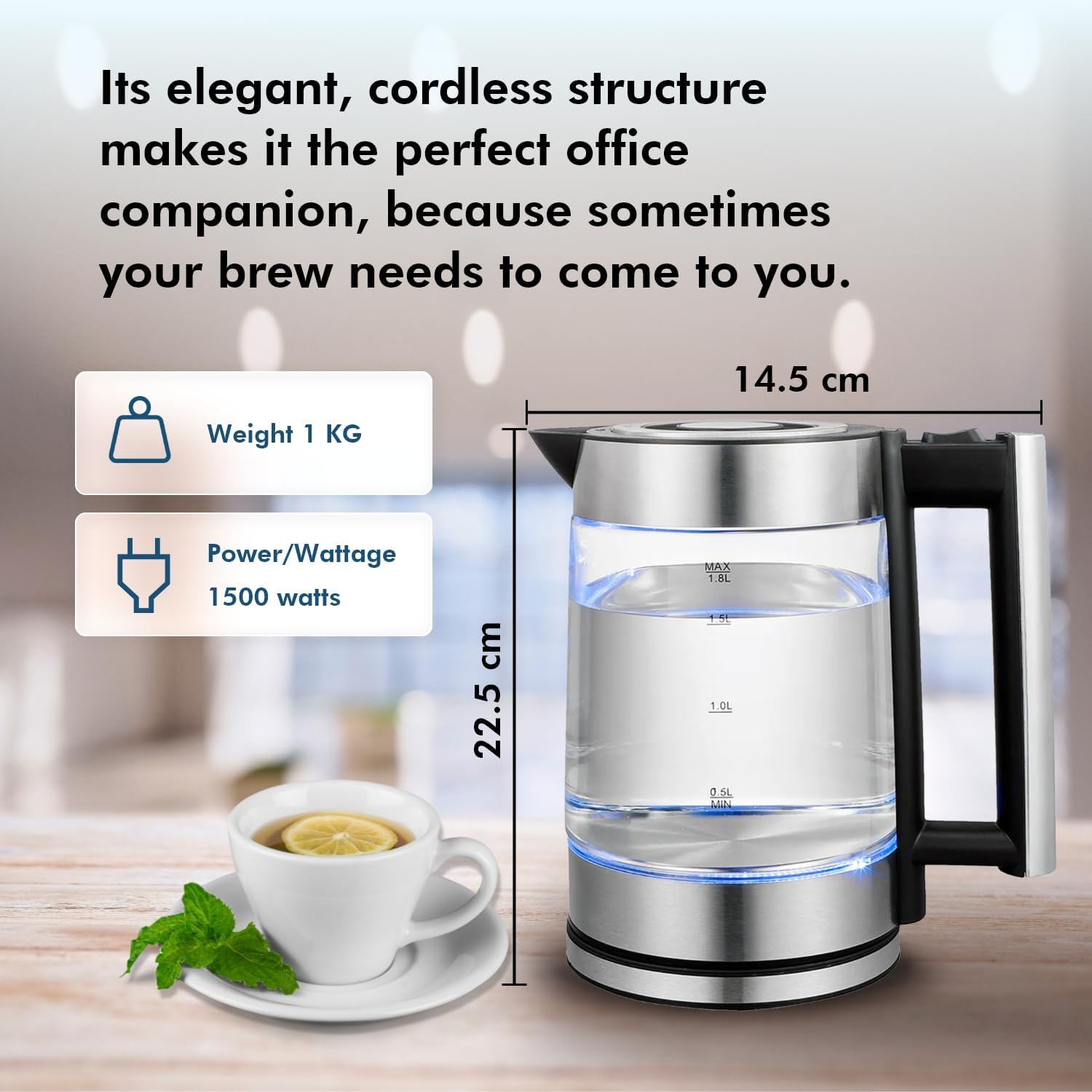 Elevate your tea break with this stylish, glass-bodied kettle featuring stainless steel accents and a lid. Its generous 1.8-litre capacity and automatic shut-off ensure it's ready for endless coffee refills. Watch as the blue LED illuminates the water as it boils, creating a mesmerizing display. The cordless design makes it an ideal office companion, bringing your brew to you. The removable, lockable lid ensures hassle-free filling, while 360-degree base rotation, overheating protection, and intelligent stainless steel heating technology provide convenience and safety. This 1.8L Cordless Glass Kettle offers everything you need to boil the perfect brew with ease and sophistication.