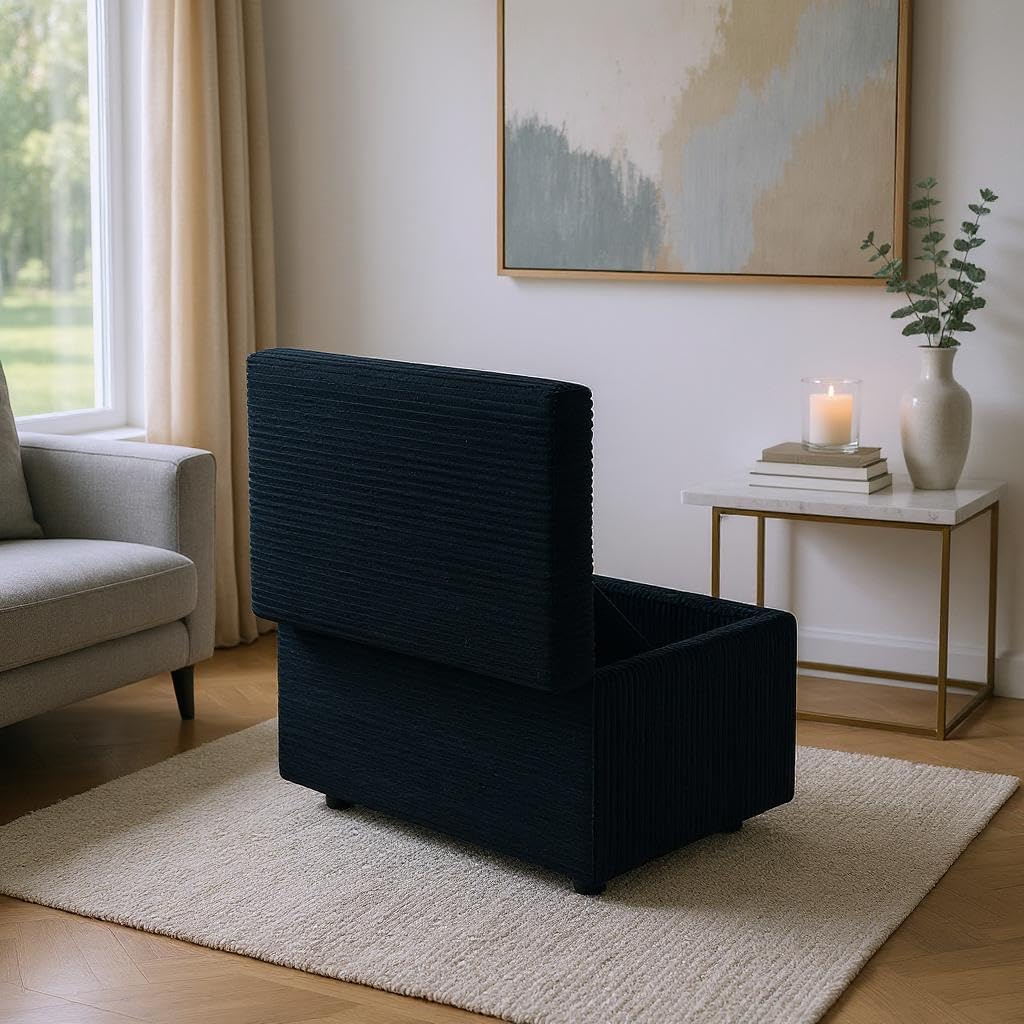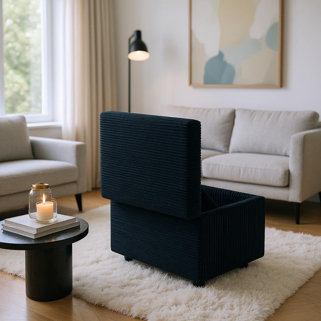 Elevate your space with a thoughtfully designed storage ottoman that blends everyday function with contemporary style. Crafted with premium corduroy fabric, this piece offers a rich texture and inviting softness — perfect for relaxed seating, footrest use, or as an impromptu side table. The gently padded top ensures comfort without compromising structure or support. Inside lies a spacious, easy-access storage compartment — ideal for tucking away blankets, extra cushions, books, or remote controls. Keep your living area neat and intentional while maximizing utility in compact layouts. Sturdy black rubber feet provide stability and floor protection, minimizing movement and safeguarding hard surfaces from scuffs or marks. Its balanced proportions make it equally at home beside a sofa, at the end of a bed, or in a cozy reading nook. Designed for durability and daily life, the frame supports consistent use while maintaining its shape and finish over time. Simple assembly and lightweight portability allow for effortless repositioning as your needs evolve.