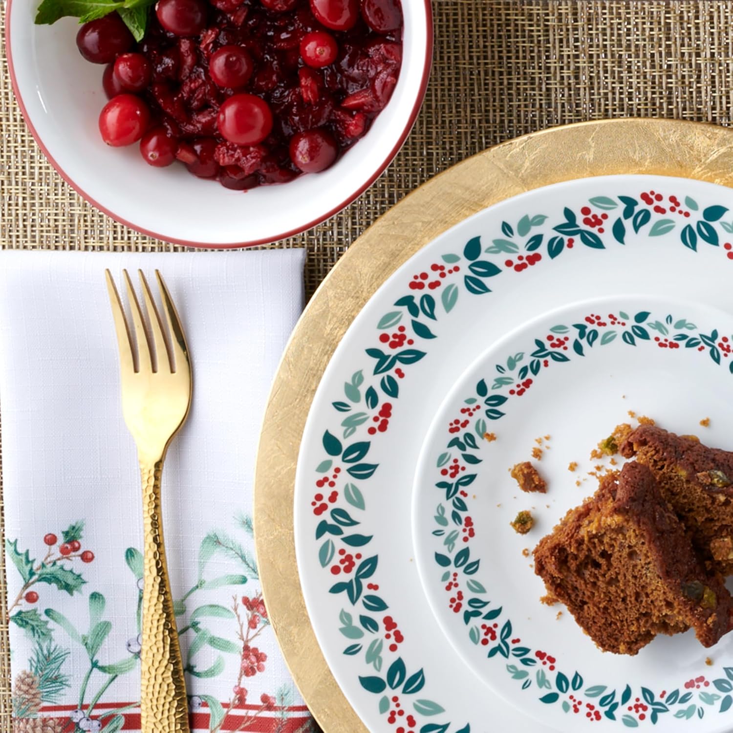 Functional and versatile, this Corelle living ware dinnerware set brings timeless and classic styling to your dining experience. This set includes 18 pieces total, including six (6) sets of each: 10-1/4-inch dinner plates, 6-3/4-inch bread and butter plates, and 18-ounce soup/cereal bowls. This Christmas dinnerware set features a classic holly motif as a modern take on vintage design. The perfect set for a charming and elegant holiday table! All pieces are made of Corelle triple-layer strong Glass, which is break and Chip Resistant, lightweight, and easily stackable for space saving. Dishwasher safe, this non-porous and versatile dinnerware can be used in the microwave and oven.