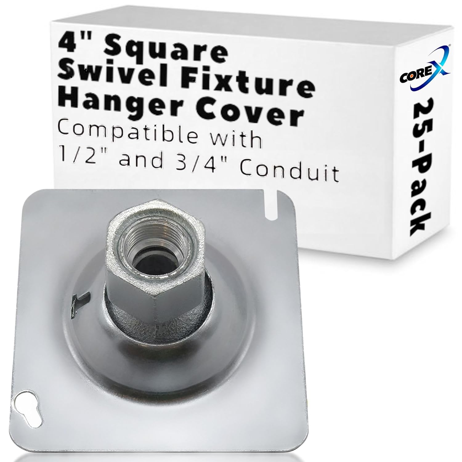 For use with standard 4" round (octagon) steel electrical boxes. Used to hang lights, exit signs, speakers, security cameras, anything electrical from a flat or slanted ceiling-mounted box. Malleable iron swivel hub with steel cover and reducing bushing to allow use with 1/2" and 3/4" threaded nipples and conduit.