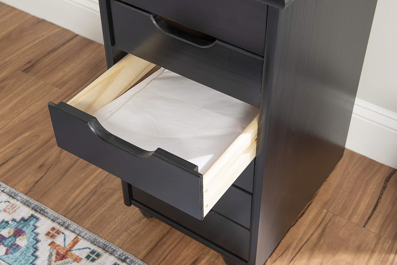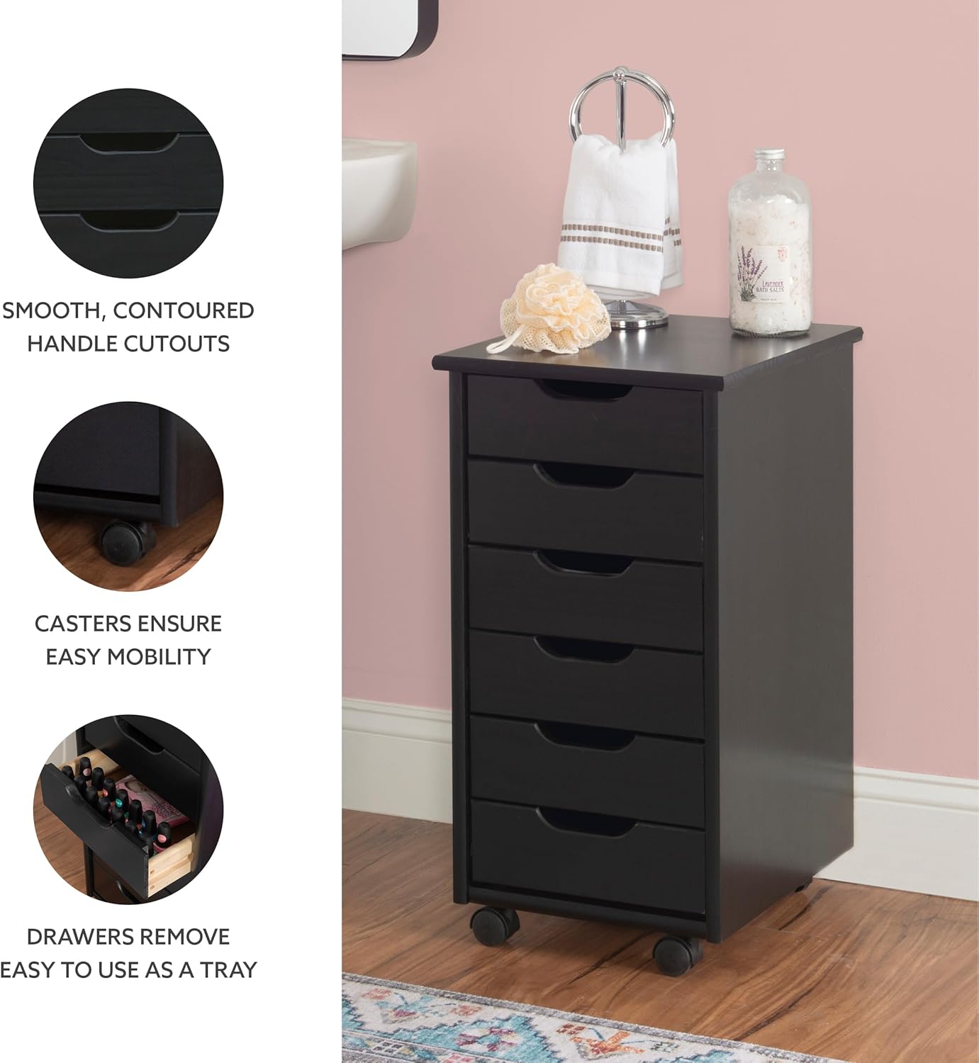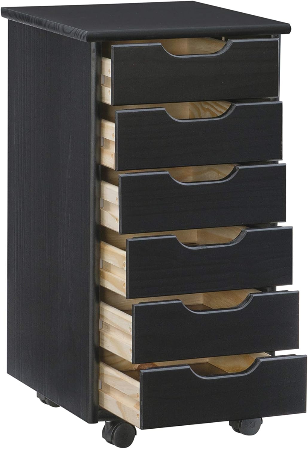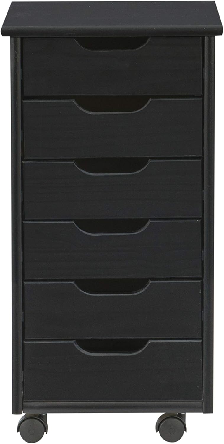 Crafted with a sturdy pinewood frame and finished in a black varnish, this piece provides functional storage and a clean, modern aesthetic. The 6 drawers provide ample space for organizing everything from office supplies and craft materials to clothing accessories and household essentials. The smooth-glide design and recessed handles allow for effortless access, while the compact build is ideal for making the most of tight quarters. Caster wheels ensure easy and smooth mobility. With a height of 25.75”, this piece is perfect for placement next to a desk, vanity, sink, or tucked into a closet.