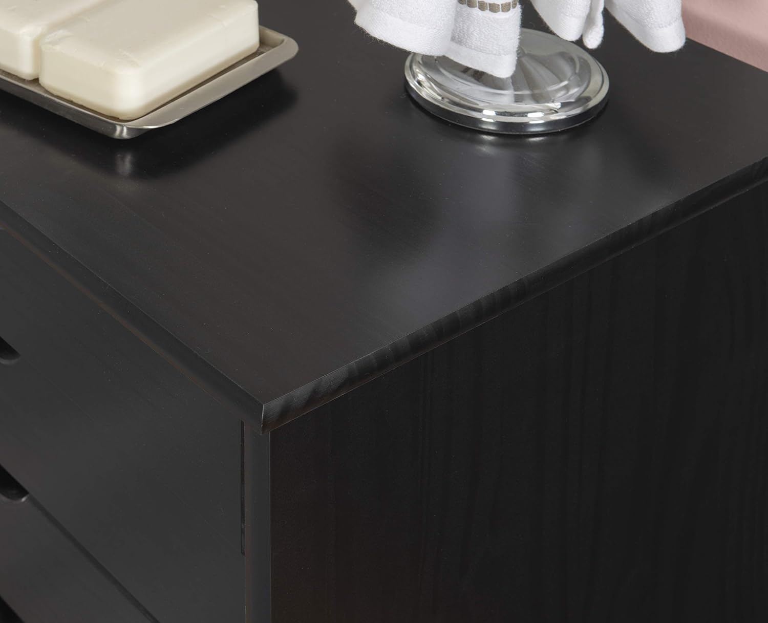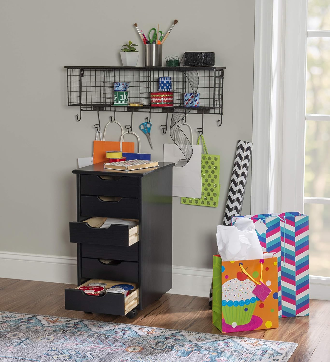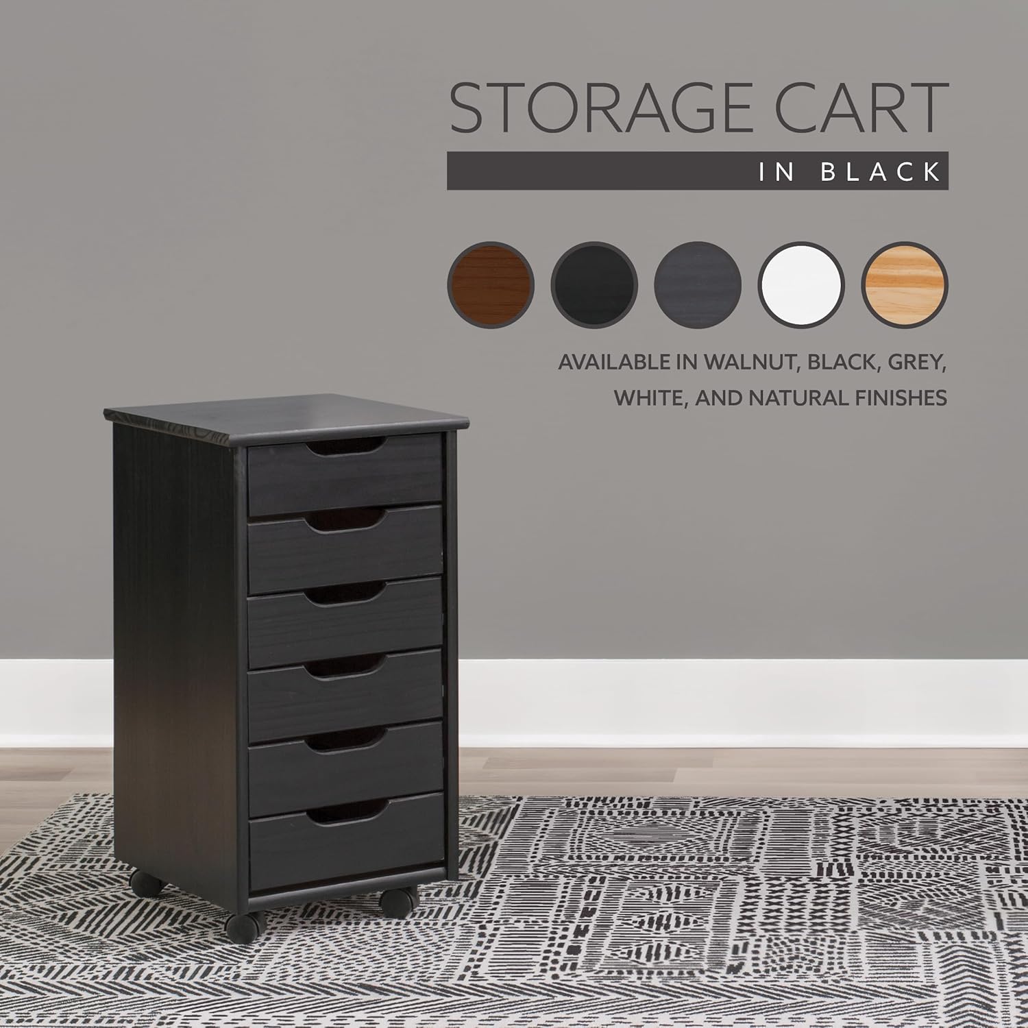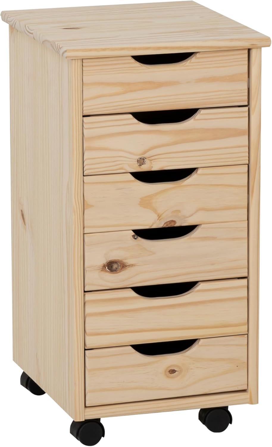 Crafted with a sturdy pinewood frame and finished in a black varnish, this piece provides functional storage and a clean, modern aesthetic. The 6 drawers provide ample space for organizing everything from office supplies and craft materials to clothing accessories and household essentials. The smooth-glide design and recessed handles allow for effortless access, while the compact build is ideal for making the most of tight quarters. Caster wheels ensure easy and smooth mobility. With a height of 25.75”, this piece is perfect for placement next to a desk, vanity, sink, or tucked into a closet.