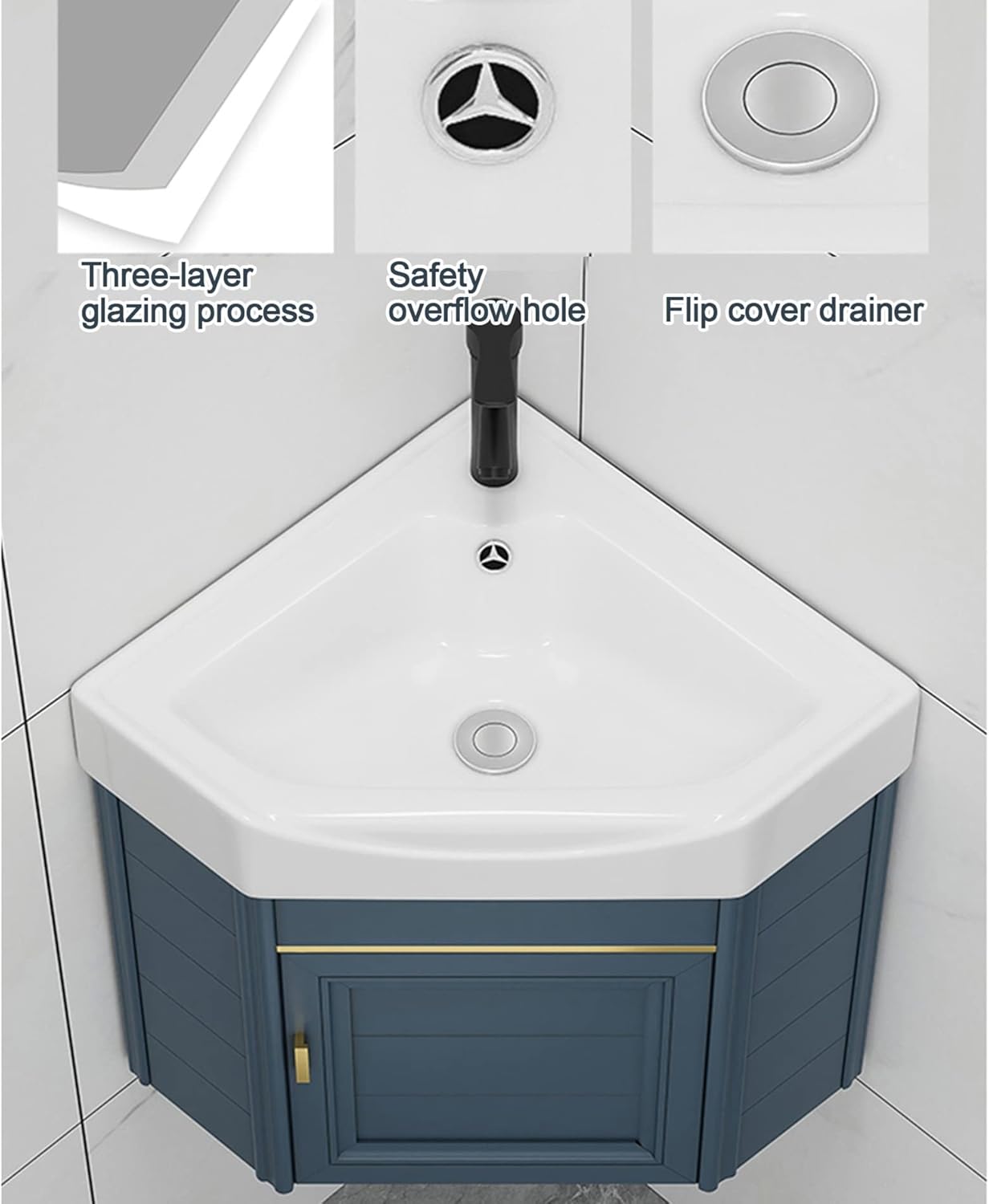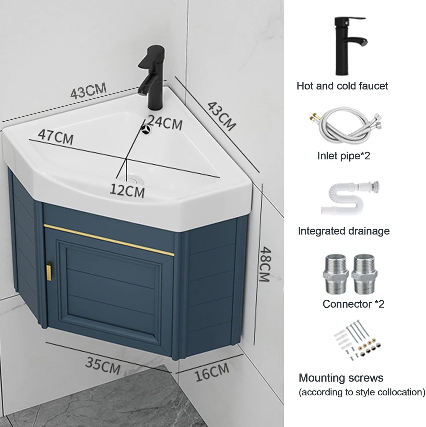 Corner Bathroom Vanity Sink Combo for Small Space Wall Mounted Cabinet Set,Wall mount sinks save space without sacrificing the luxury of a spacious sink,perfect for small bathrooms and powder rooms. FEATURES:Utility Washing Hand Basin Constructed from Vitreous China,Scratch and Stain Resistant Finish for durabilityThe space aluminum cabinet is designed to not only withstand threats of moisture and humidity but also easy to clean and maintain.It has a large storage space behind door, enough room for taking in all daily toiletries. Keep the bathroom neat and clean.SPECIFICATION:Product Name: Utility Corner Bathroom Vanity Sink Combo Sink Material: Ceramics basinCabinets Material: Space AluminumSize: 38x38x42cm , 43x43x48cm , 47x47x48cmPACKAGE INCLUDE:1 x Sink1 x Cabinet1 x Drain1 x Faucet2 x Inlet pipe2 x connectorMounting screws 100% SERVICE:If you have any questions, please feel free to contact us directly. We will reply you within 24 hours and provide a solution.