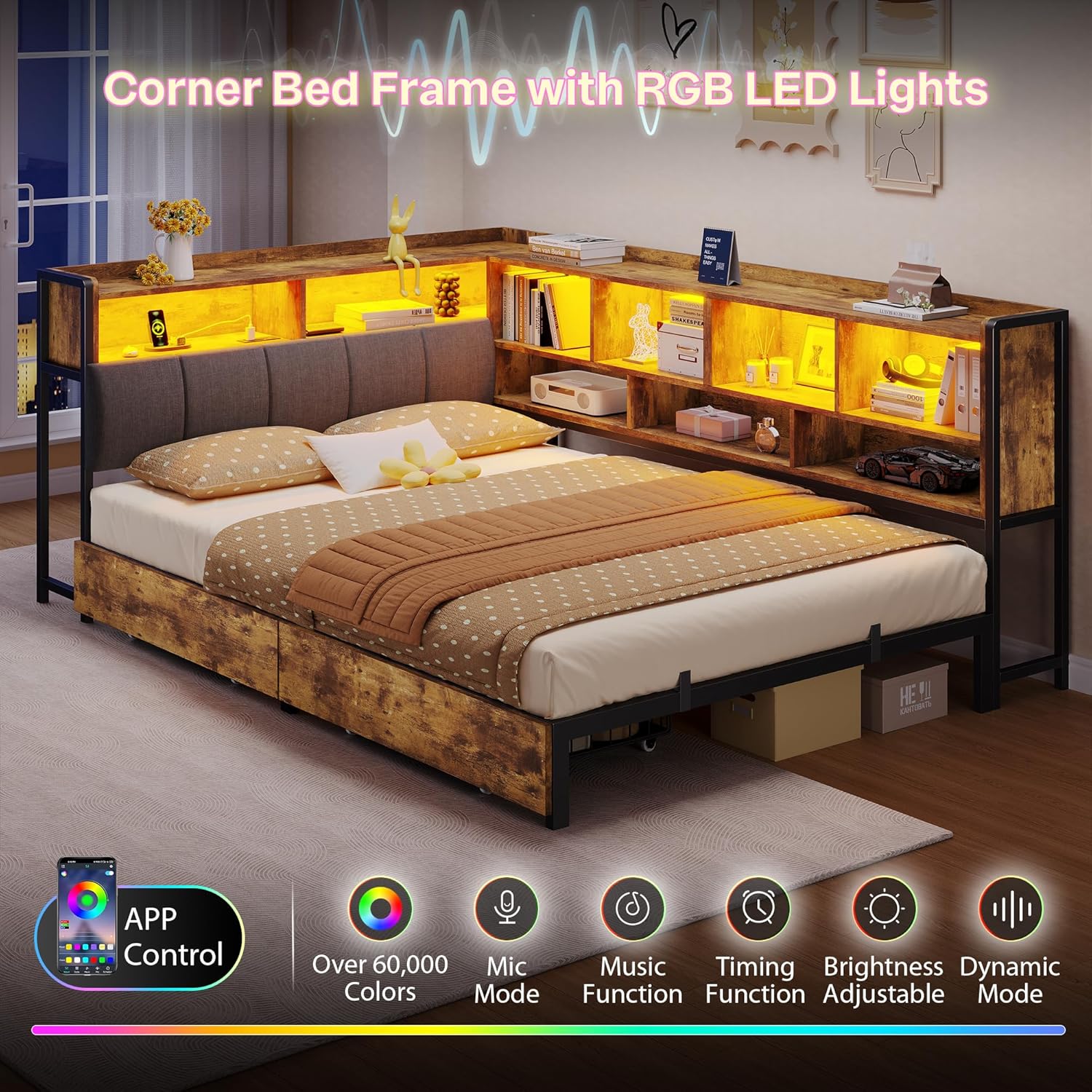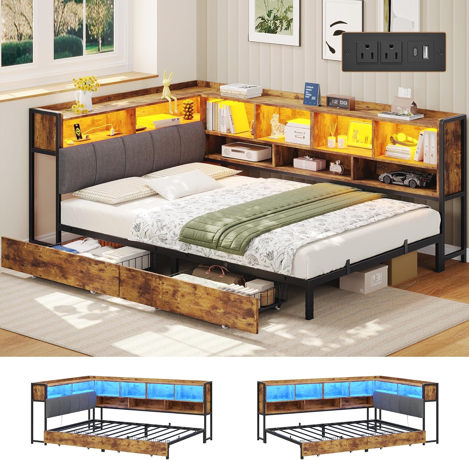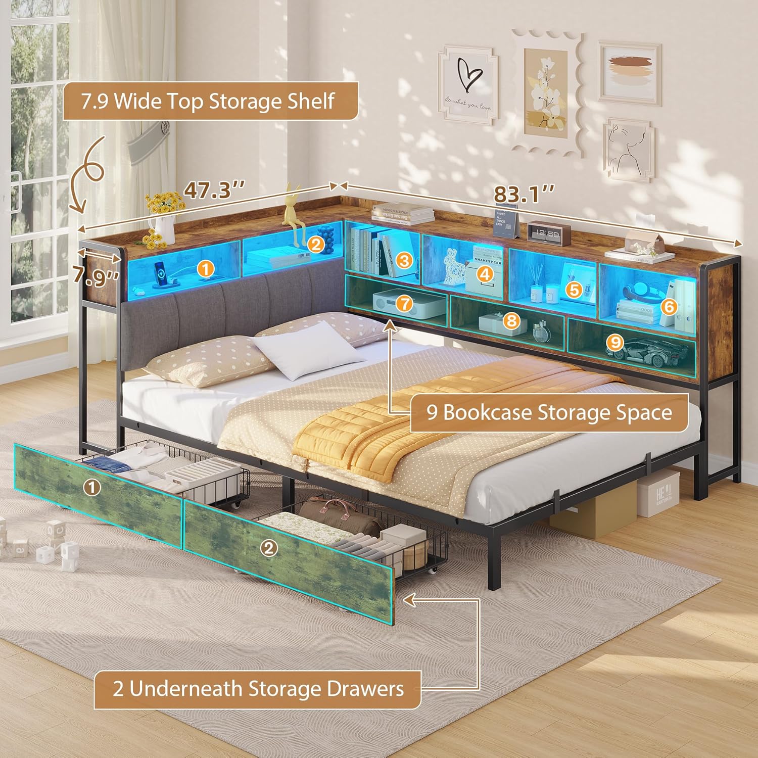 | Included Components | Corner Bed FrameX1,Upholstered HeadboardX1,LED Light StripsX1,Charging StationX1,Underneath Storage DrawersX2,Bookcase Storage SpaceX9,Clear instructionX1 |