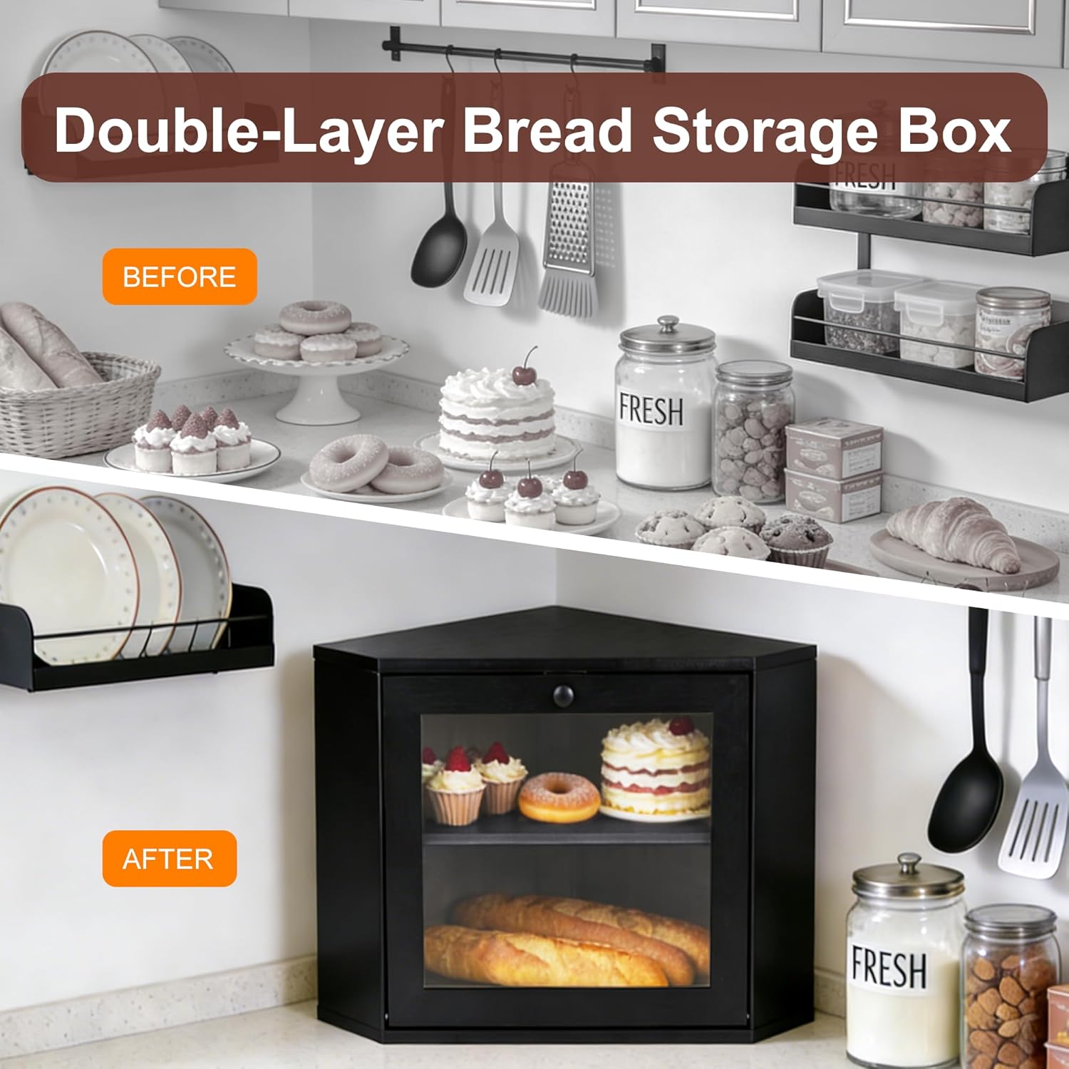 • Double Layer Large Bread Box: 2-tier spacious interior; clear acrylic window for visibility, strong magnetic latch for quiet, easy use