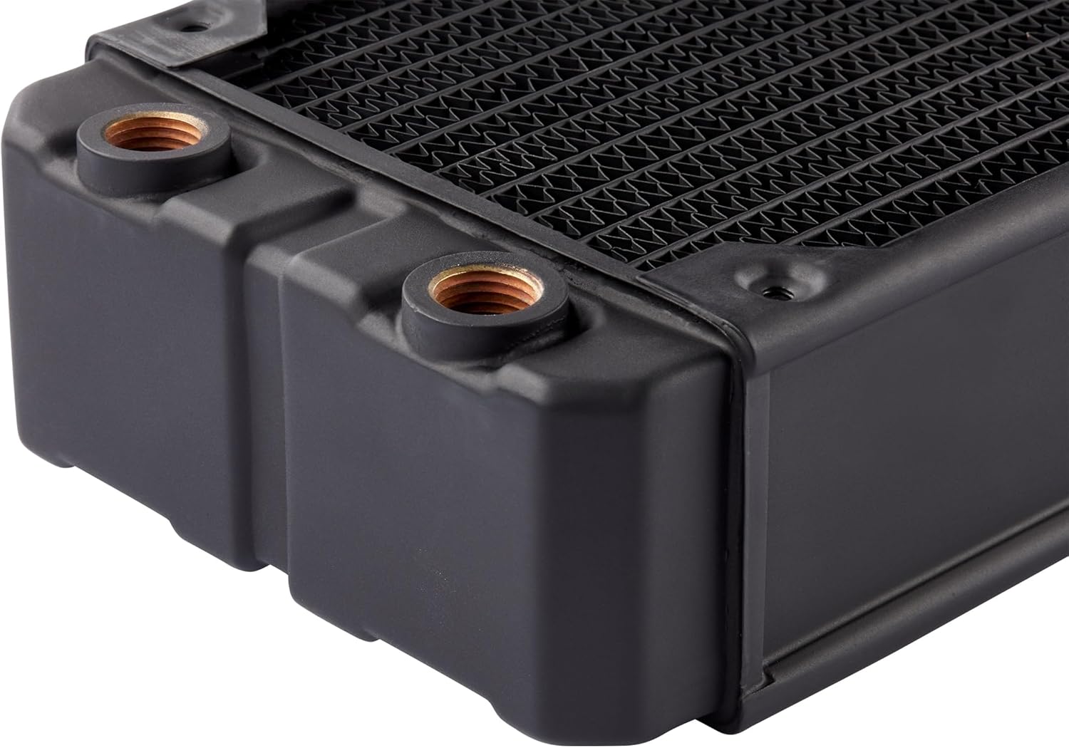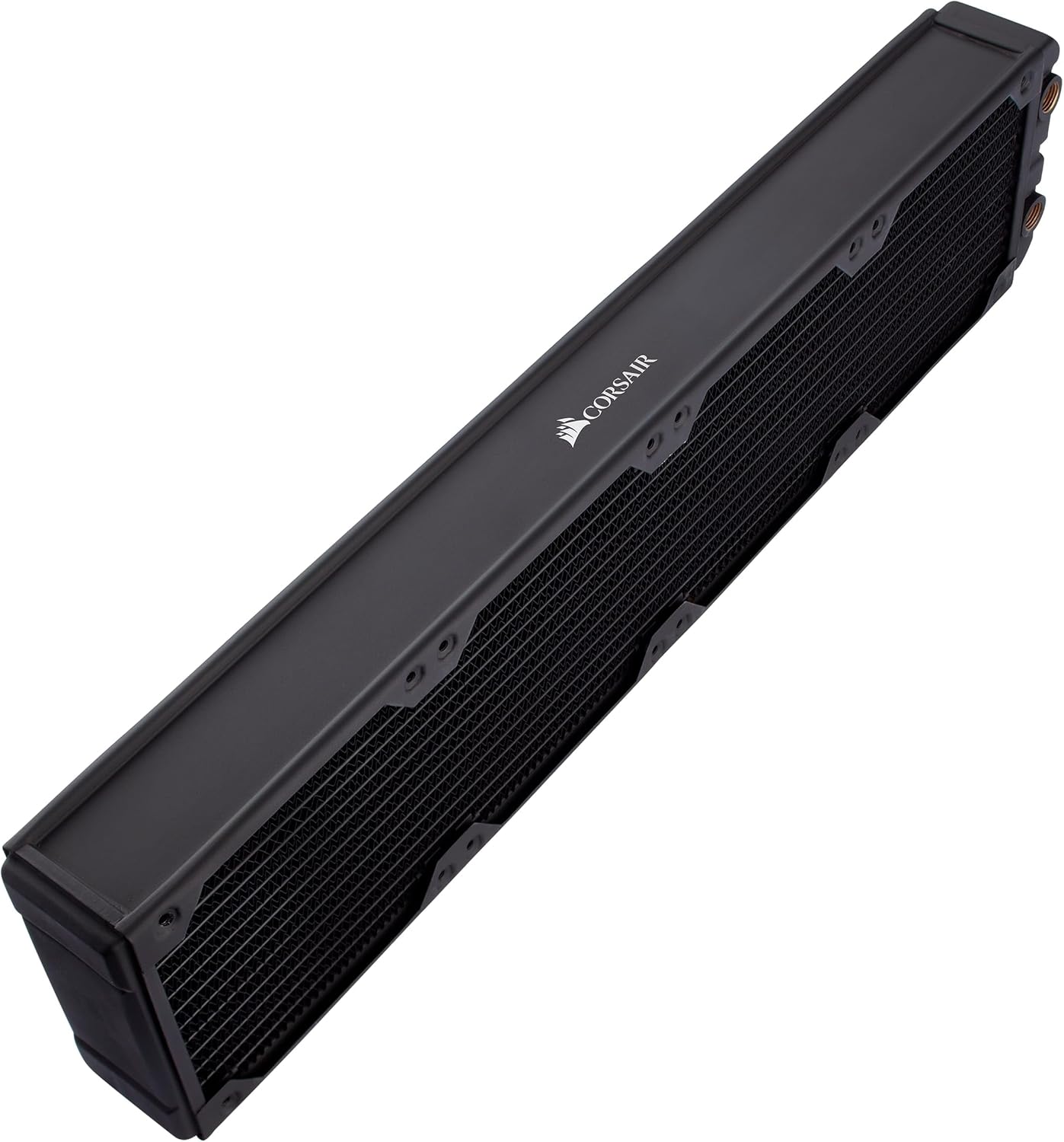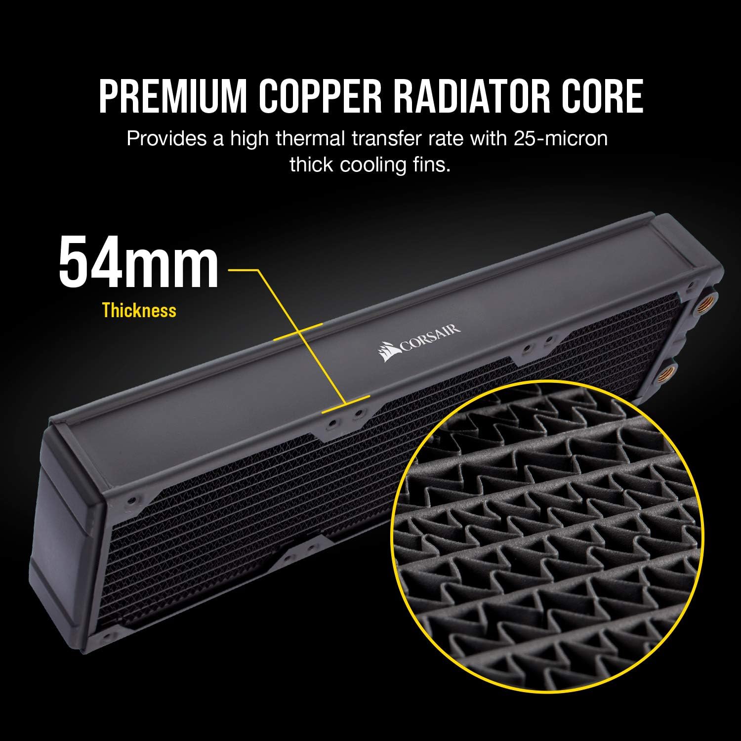 The CORSAIR Hydro X Series XR7 240mm Water Cooling Radiator delivers extreme custom liquid cooling performance, with 54mm radiator thickness and 25 micron thin cooling fins maximizing heat dissipation surface area. A premium copper radiator core core is optimized for use alongside copper CPU and GPU water blocks, further increasing the thermal transfer rate. Intuitive extras such as Integrated Fan Screw Guides and built-in Screw Protection Plates make it easy to install fans, without worrying about damaging the radiator. Equipped with standard G1/4" threads for universal compatibility and the surface area to tame even the highest-end hardware, the XR7 240mm radiator stands ready to cool even the most ambitious custom cooling loops and defeat the heat.Dual 120mm fan mounts on either side of the radiator are ready for your most ambitious custom liquid cooling build30mm radiator thickness delivers extreme cooling performance with high-airflow and low-noise fans.A premium copper radiator core and 25 micron thick cooling fins provide a high thermal transfer rate optimized for CORSAIR’s performance copper water blocks.High-quality matte black polyurethane coating delivers a flawless finish to match your system.Integrated Fan Screw Guides make it easy to install fans even when the radiator is fitted into a case.Screw Protection Plates prevent too long or over-tightened screws from damaging the radiator core.Standard G1/4” threads for all inlet/outlet ports provide universal fitting compatibility.Radiator Dimensions: 275mm x 120mm x 55mmScrew Thread Size: M4xP0.7Materials: Copper / BrassCompatible Materials: Only mix with other copper / brass products Model: CX-9030004-WW