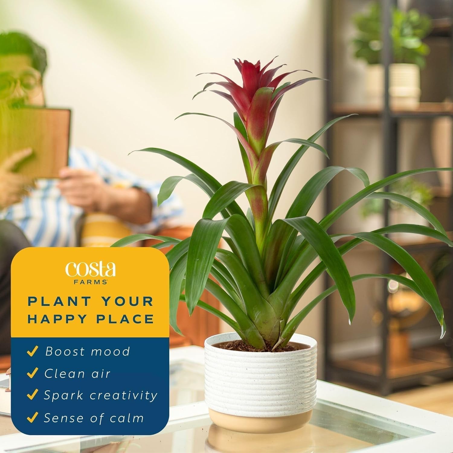 This bold, stylish houseplant looks stunning in contemporary, modern, and tropical decors. Bromeliads have colorful, long-lasting blooms (which last for weeks) that contrast beautifully against the strappy green leaves. Color assortment is selected at time of shipping; colors range from vibrant reds, bright yellows and deep purples each is carefully selected by our expert growers. After the main flower on bromeliads begins to fade, The mother plant will begin to decline. But you'll see baby bromeliads (called pups) developing around the base. Grow these out and enjoy more bromeliads! They grow best in a sunny window, place it next to an East or West facing window. Water when the soil is dry (about once a week) and be sure all excess water drains away. If the container does not have holes, use approximately half a cup of water, adjust as needed for your environment. Do not let the Bromeliad sit in water or overly soggy soil. The height at shipping is approximately 20 inches tall, measured from the bottom of the pot to the top of the plant. The Bromeliad ships in a lightweight, 6-inch decor planter; made from a 100% recyclable #5 material. To avoid water spillage, this container does not have holes. The Bromeliad is a slow grower depending on its environment and is hardy in USDA Zones 9-11. Give it a boost during the warm months of Spring and Summer with a general-purpose fertilizer that is formulated for house plants. Follow the instructions on the fertilizer package for the best use. When the plant out grows the current container, it is time to repot. To repot the plant, gently remove it from its current container and place it into a slightly larger container. Fill in any empty spaces with new and fresh soil and water thoroughly. Be aware of third-party sellers; other companies try to imitate our quality. There are no other authorized Costa Farms sellers. Look for ships from & sold by to ensure you’re getting our premium plants. Plants are living things; each one is slightly different, so the plant you receive may vary from the photo. Our growers hand-pick the healthiest and highest-quality plants. We package our plants for shipment with great care so they'll arrive at your home ready to be displayed. Shipped fresh from our farm to you, Costa Farms is passionate about delivering happy, healthy, beautiful plants. Costa Farms plants are not intended for human or animal consumption. Keep out of reach of children and pets. We're unable to ship this item to: AK, AZ, CA, GU, HI.