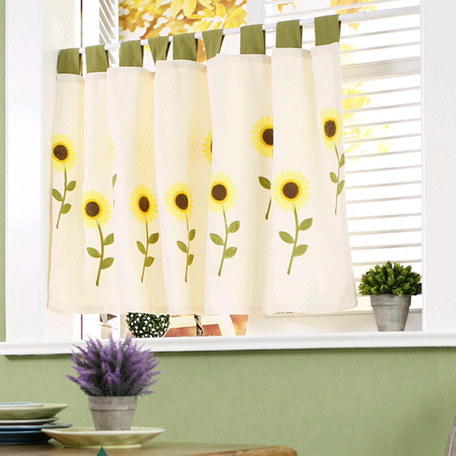 ☀ The sunflower embroidery design brings a touch of freshness, it perfectly showcases your refined taste and is suitable for adding glamour to any room decor.☀ Compelling Reasons to Choose Our Short Curtains- Fine workmanship, high-quality, durable.- The style is simple, beautiful and generous, adding a comfortable feeling to your home.- The half covering of the kitchen window will not affect the light in the room and provide more privacy.- Thickened fabrics can reduce sun exposure. Let you enjoy a comfortable environment every day, keep your room at the perfect temperature.- Pole pocket design on top , easy to hang up with a curtain rod. - Perfect for use in the kitchen, dining room, bistro, cafe, bedroom, etc. A great choice to decorate your windows.- Easy to clean, soft and skin-friendly, giving you a comfortable and healthy environment.☀ Specifications- Product Name: Sunflower half curtain- Material: Cotton- Style: Modern fresh style- Size (WxH): Width and height can be customized- Use place: Cabinet, small window, cupboard, interior door.- Care instructions: Gentle hand wash in cold water at or below 30°C- The package includes: 1 short curtain (not including the rod)☀ Tips- The size is measured by hand, there may be 1-3 cm error.- For proper padding, the panel should be 1.5 to 2.5 times the width of your window (Example: if you have a 100cm wide window, we suggest you buy 150 - 200cm.)- Due to the condition of the monitor, the color of the picture and the actual product may differ. Please understand this beforehand.