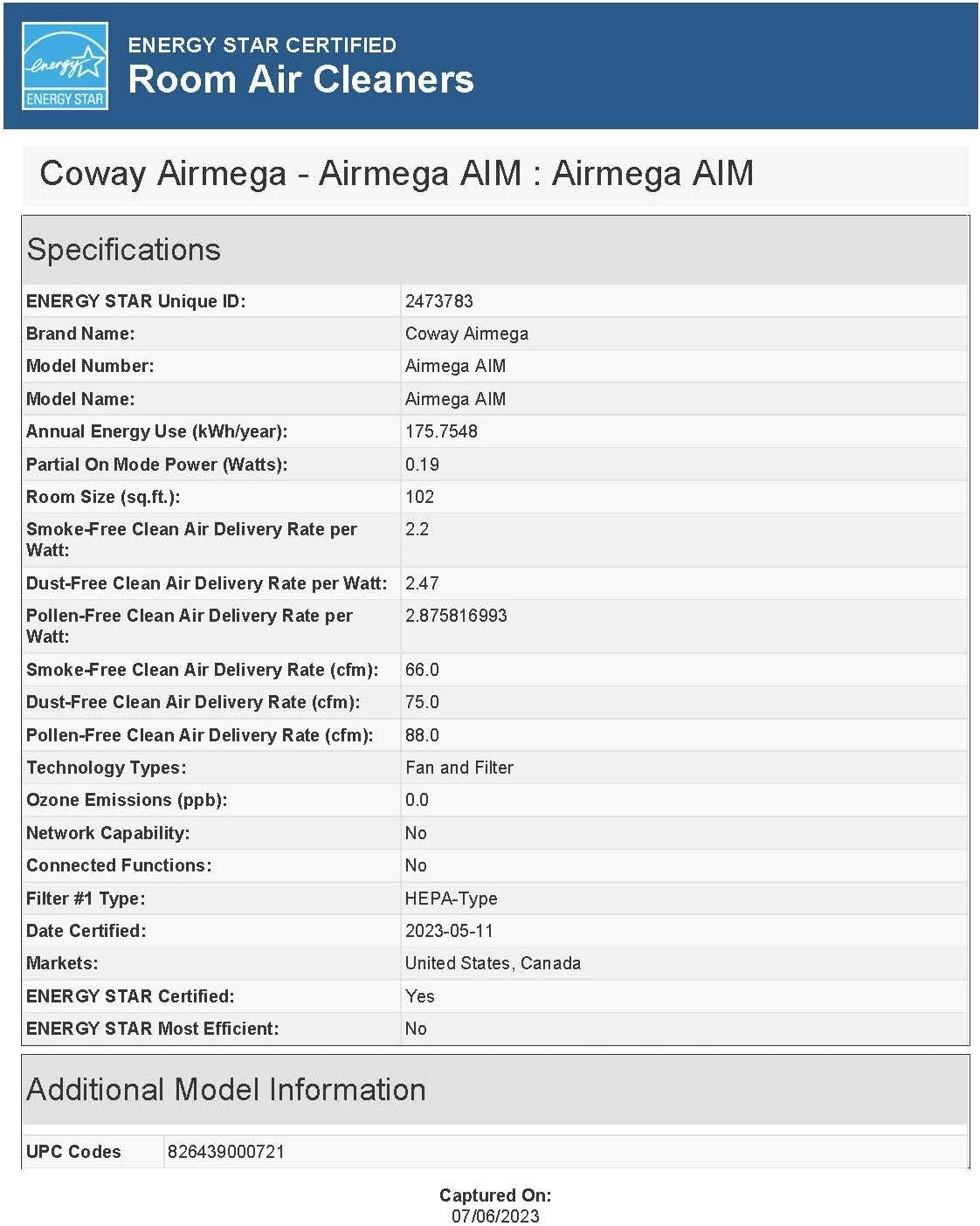 | Special Feature | Smart Mode; Air Quality Monitor; Filter Life Indicator |