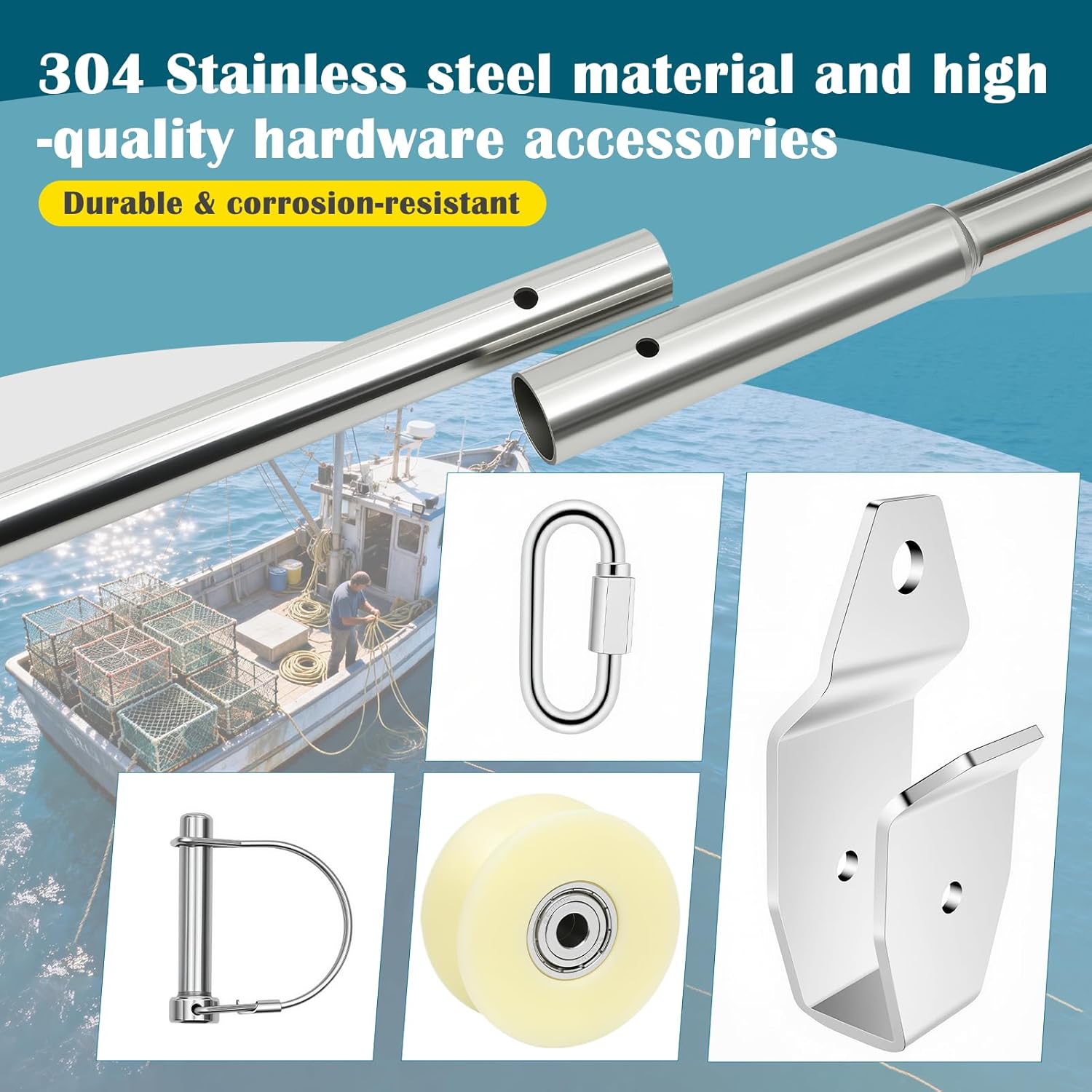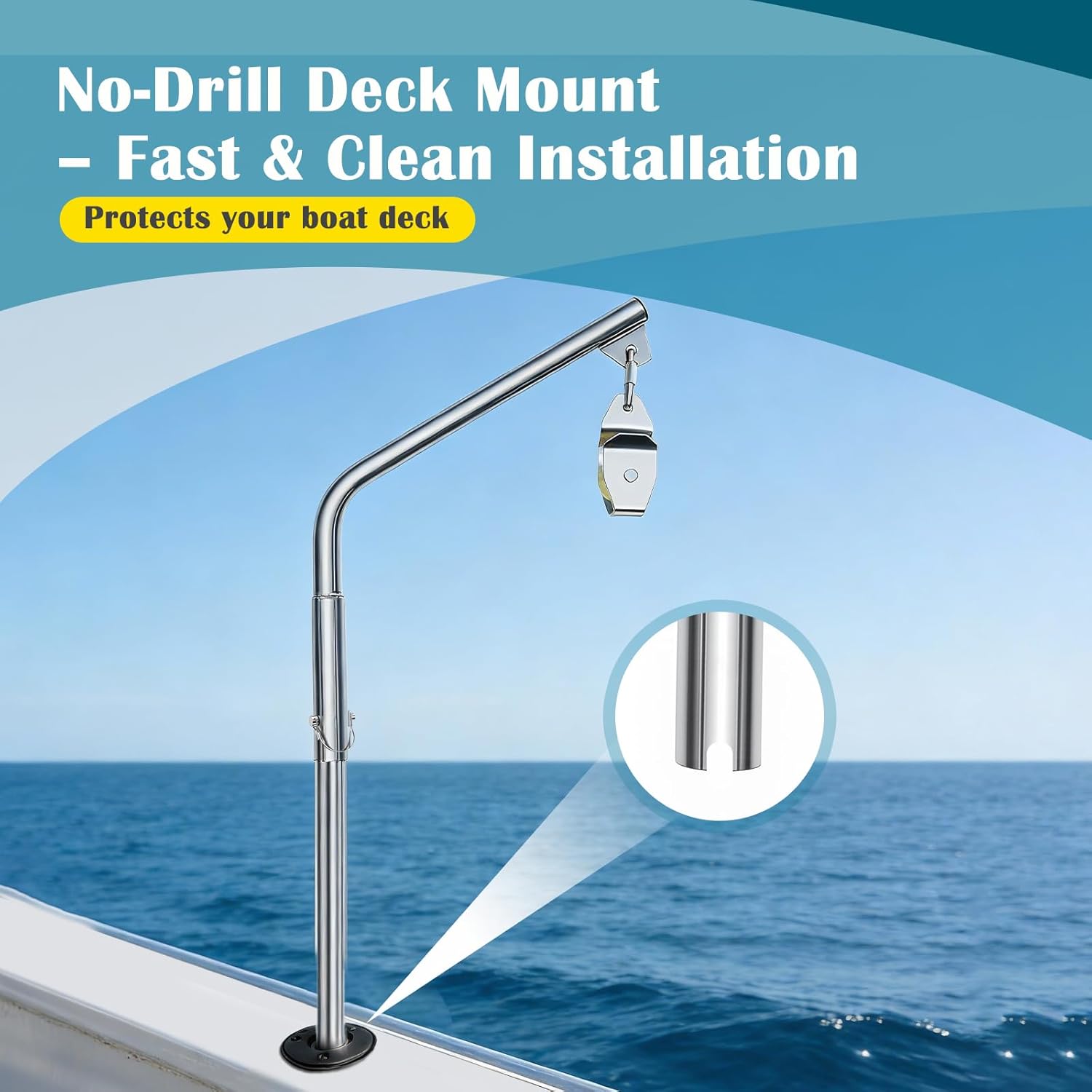 Premium Crab Pot Pulling Made Easier.This Schedule 40 Crab Pot Puller Davit Package is engineered to deliver dependable lifting power with minimal effort. Constructed from heavy-duty Schedule 40 stainless steel, it provides up to 250 lbs of lifting capacity—perfect for crab pots and traps.Built for Strength and Smooth Operation. The system includes stainless steel mounting brackets for reduced friction and long-term durability, along with a 7-inch open face pulley block for smooth, efficient line handling.Durable Stainless Steel End Cap. The davit end cap is made from 304 stainless steel with a thickness of 3mm, offering excellent corrosion resistance and strength in marine environments.Quick Setup, Easy Storage.The two-piece design and quick-release bolt system allow the davit arm to be removed quickly for storage or transport, keeping your deck clear when not in use.No Drilling Required. Whether you're pulling pots regularly or seasonally, this premium davit system provides the mechanical advantage you need to work smarter—not harder.