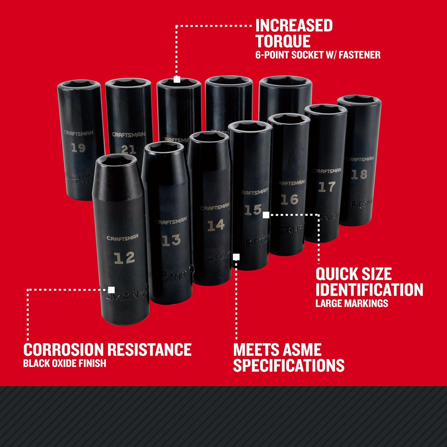 12-piece Metric Deep Impact Socket Set is engineered and constructed to endure high torque application with impact wrenches and impact sockets 1/2 drive. These impact metric sockets are specially designed to engage with the flats of fasteners to prevent rounding so it's time to turn up the torque and turn tough jobs into easy ones.