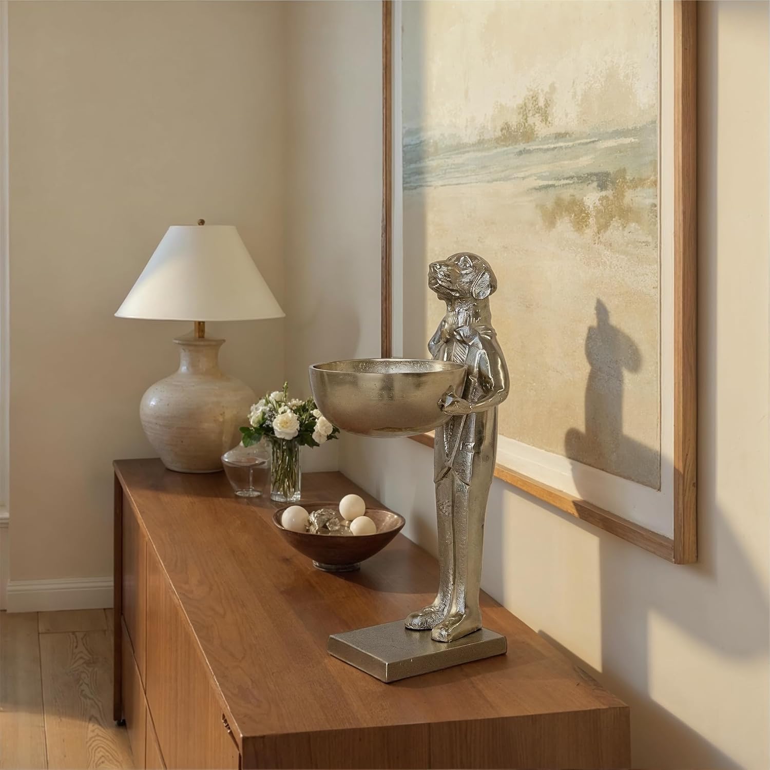 Add heartwarming charm and golden allure to decor displays with this Cast Aluminum Labrador Bowl, where nostalgic storytelling meets refined craftsmanship. With ears perked and posture poised, the finely sculpted pup presents a shallow bowl in its outstretched paws, finished in a rich antique gold that gleams softly in the light. Ideal for Farmhouse consoles, Traditional sideboards, or Glamorous vanities, it serves as both an endearing conversation starter and an elegant storage solution. Let its loyal stance and sophisticated glow bring a sense of warmth and delight to any room. Measures 8 in length, 6.25 in width, and 16 in height.