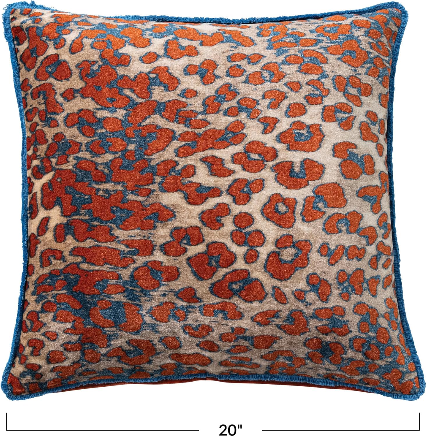 Add the Cotton Velvet Printed Square Pillow with Leopard Print Pattern and Eyelash Fringe to any space for a striking blend of comfort and artistry. A cotton velvet pillow in orange, natural, and blue with bold leopard print and eyelash fringe brings dramatic personality and artisanal detail to interiors. Perfect for Boho, Glam, French Country, Farmhouse, and Contemporary styles, it enhances sofas, beds, or chairs with decorative flair. Use it as a versatile accent that adds both cozy comfort and visual intrigue. Made of cotton blend velvet cover with microfiber fill inside, it offers softness, durability, and easy care. Measures 20.0 in length and 20.0 in height, providing balanced proportions for layering. Elevate everyday living with this thoughtfully crafted pillow that combines sustainability, design sophistication, and bold character—an accessory destined to inspire.
