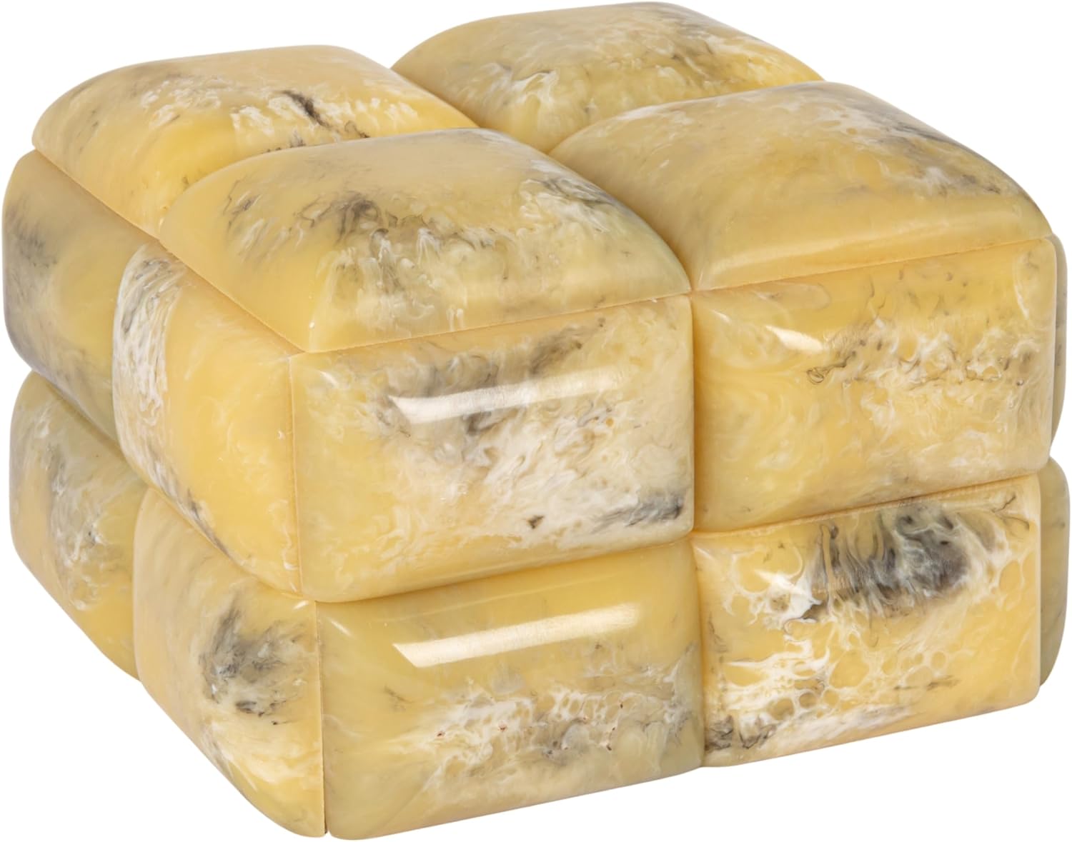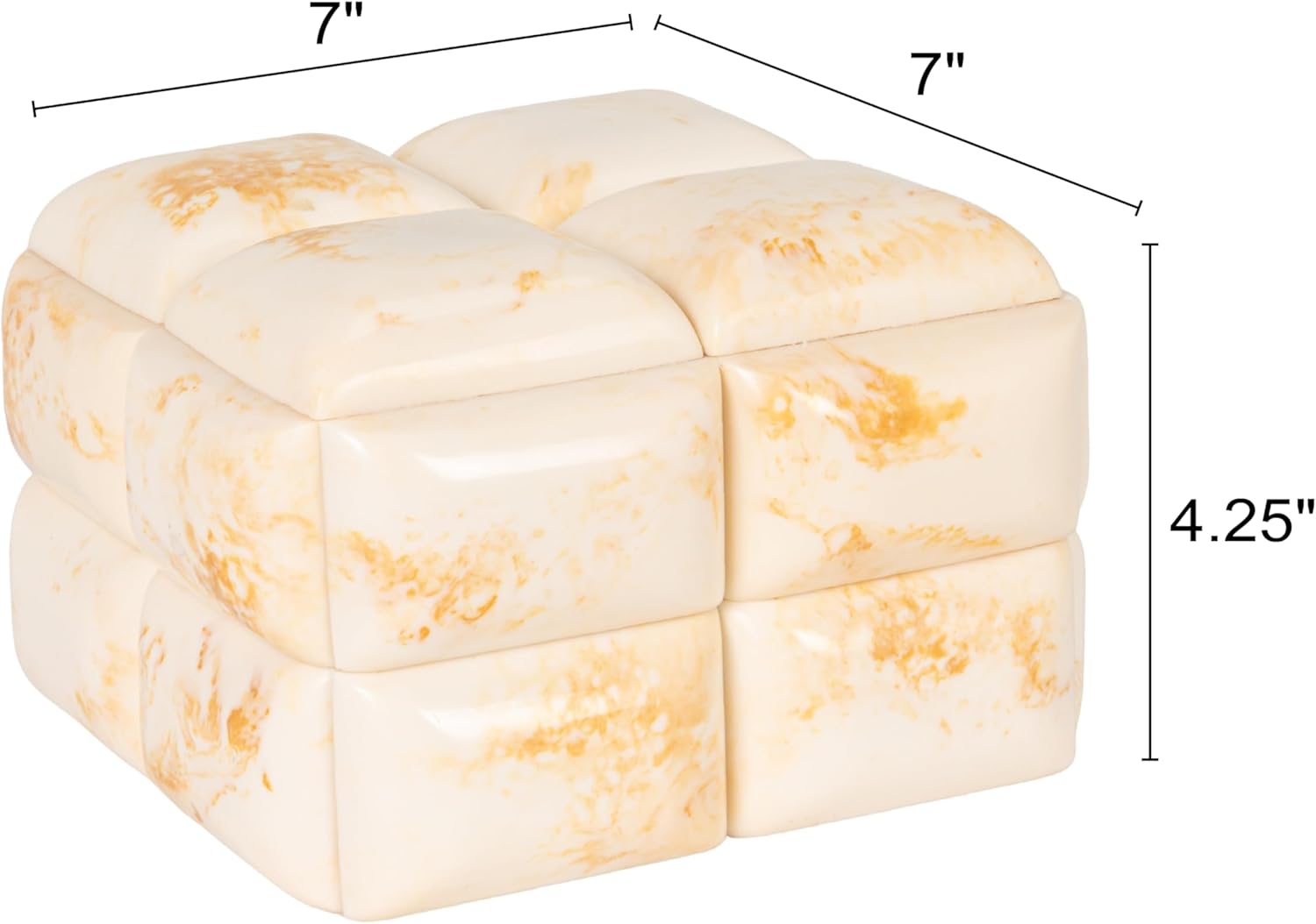 Add the Marbled Resin Square Studded Decorative Storage Box with Lid to any space for a sculptural touch that blends function with artistry. A cube-shaped resin box composed of rounded segments in a creamy ivory marbled finish offers a visually captivating design that complements Boho, Glam, Coastal, French Country, and Farmhouse aesthetics. Use it to store trinkets, jewelry, or keepsakes while elevating any surface with its tactile charm and geometric elegance. Made of high-gloss resin, this piece delivers a luxe, artisan-inspired look with easy-care durability. Measures 7 inches in length x 7 inches in width x 4.25 inches in height, compact enough for small spaces, bold enough to make a statement. A refined storage accent that invites both admiration and utility.