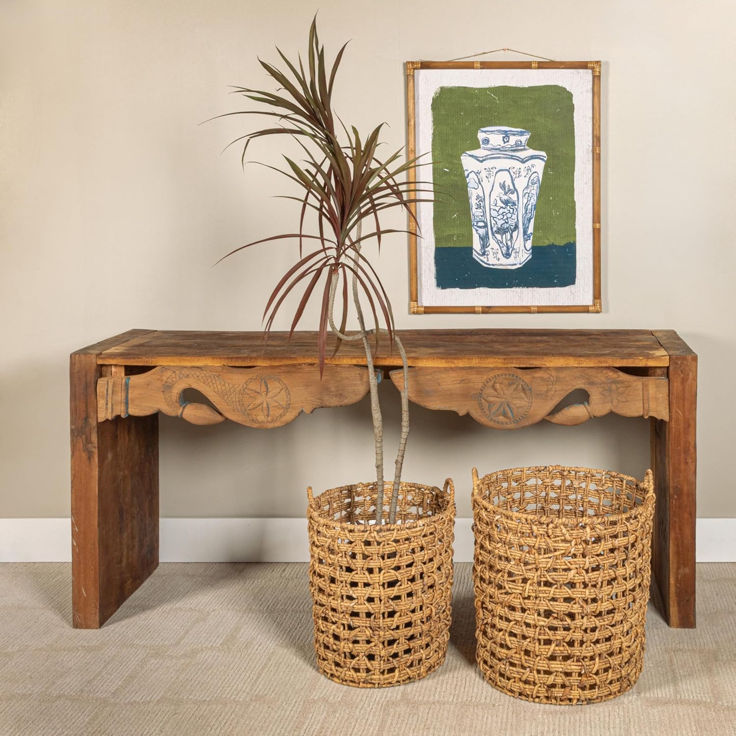 Elevate your storage solutions with this set of two round water hyacinth baskets. Skillfully handwoven, these baskets blend natural textures with practical functionality, making them ideal for organizing your space while adding a warm, rustic touch. Perfect for storing everything from blankets to toys, they offer durability and timeless appeal for any room.