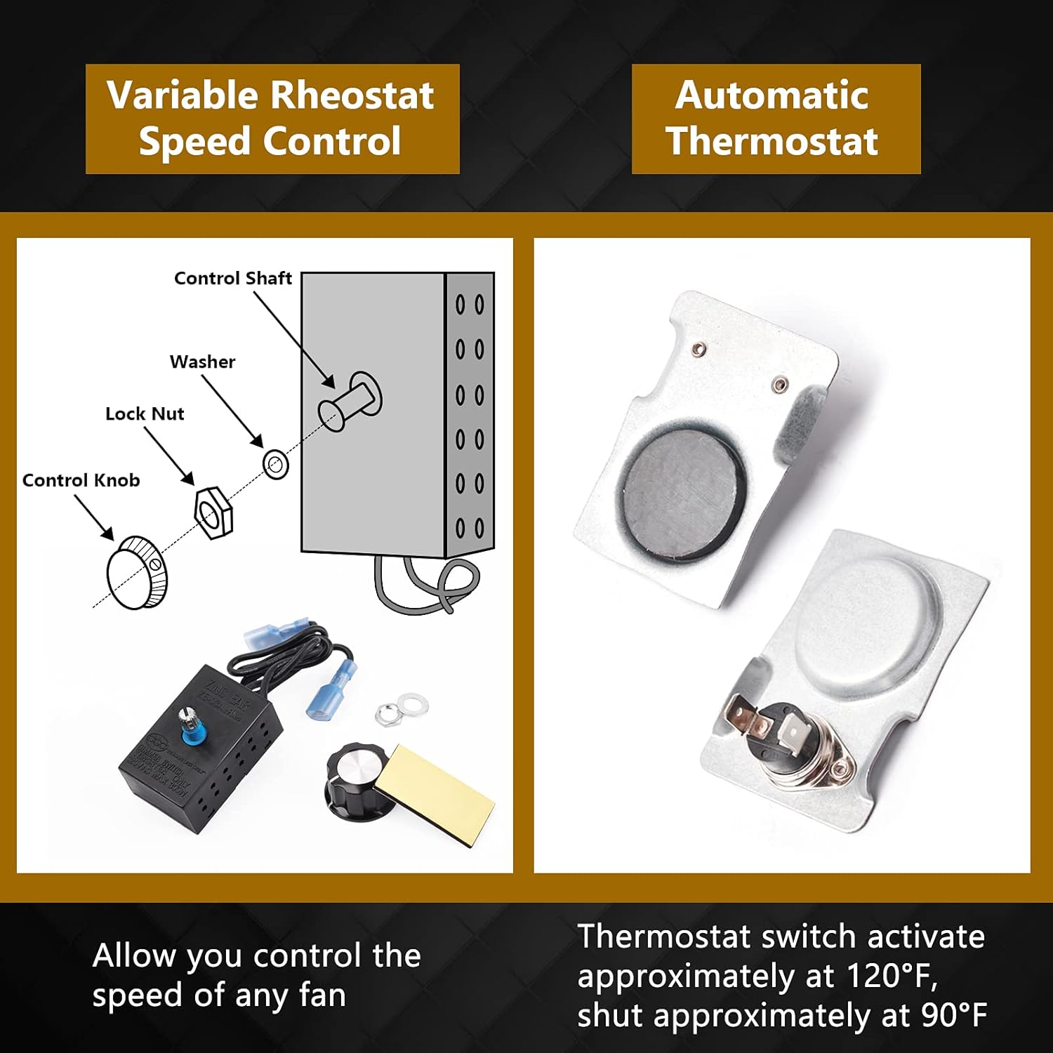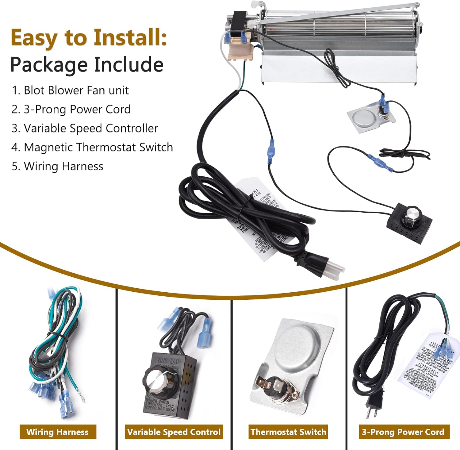 | Included Components | Blower + Thermostat + Speed Controller + Power Cord + Wiring Harness + Foam Pads + Instructions |