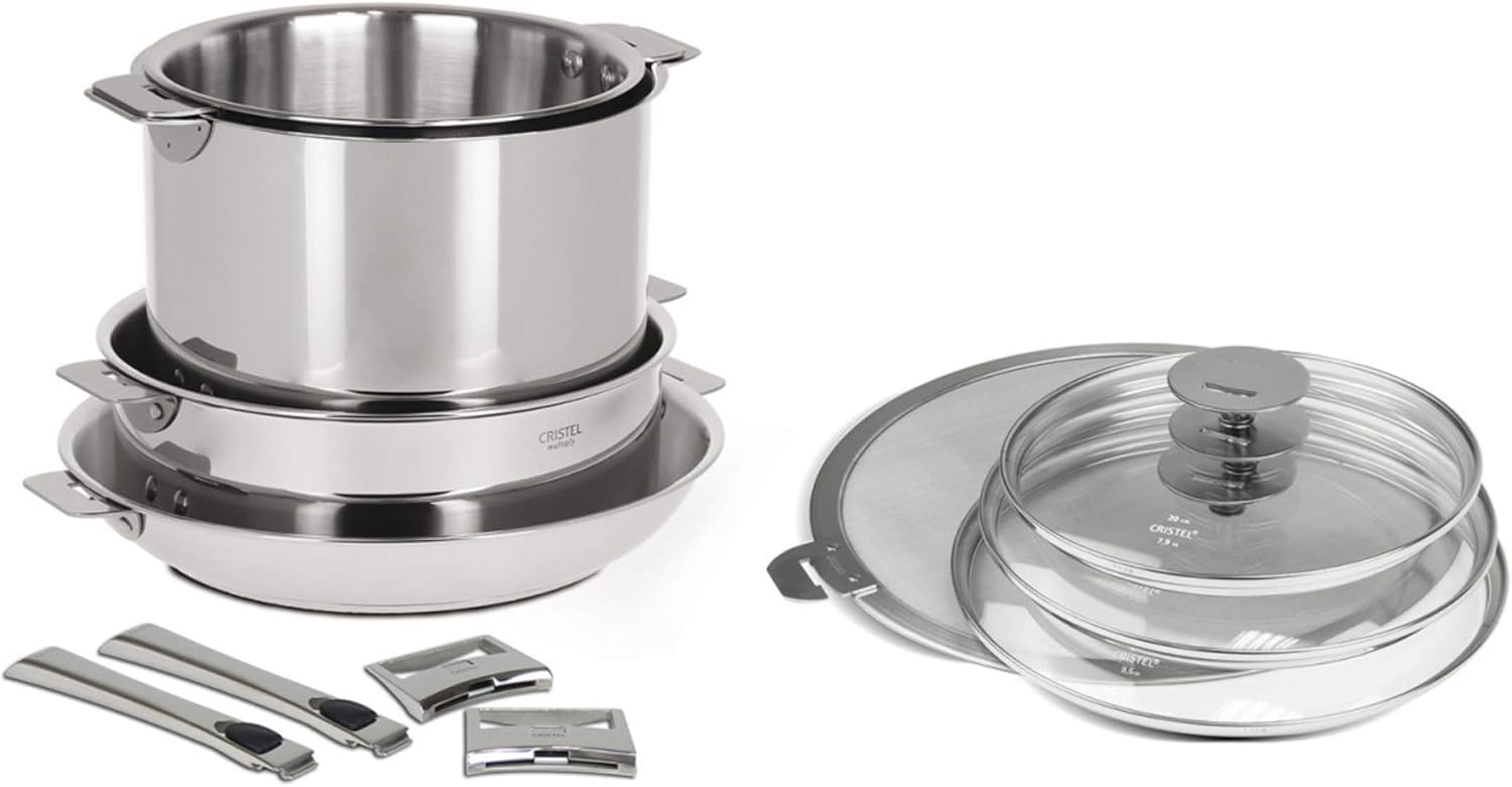 Stainless steel 12 Piece Set, shiny finish, detachable handles from Casteline collection. A must have in the kitchen, Casteline Stainless steel 12 Piece Set contains: 10 qt Stockpot + lid 11” frying pan 3.5 qt Sauce pan + lid 4 qt Sauté pan + lid 2 detable handles 2 detachable side handles Detachable handle splatter screen Certified Made in France, BV Cert. 6019453.