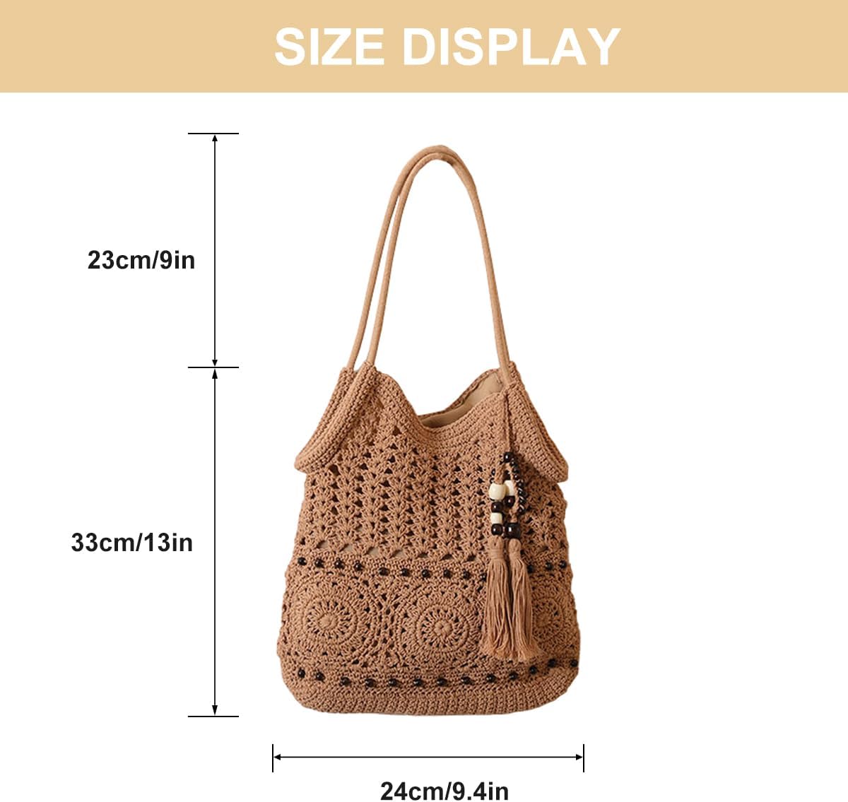 Gogobear Crochet Hobo Bag Fashion Tassels Shoulder Bag Boho Beach HandbagSpacious Lightweight DesignThe tote bag offers a roomy interior to hold beach essentials like towels and sunscreen, while remaining lightweight for comfortable carrying.Functional DetailsThe secure zipper closure keeps your valuables safe, while the soft cotton lining adds a luxurious touch. Wooden beads and tassels are carefully fastened to resist wear and tear.A perfect fusion of traditional craftsmanship and modern bohemian flair elevates your summer wardrobe. Handwoven from premium cotton thread, it features eye-catching openwork patterns and wooden bead tassels, making it a standout accessory for beach getaways, music festivals, or casual outings. It pairs seamlessly with maxi dresses, denim shorts, or swimwear, while its durable construction ensures it withstands everyday wear.