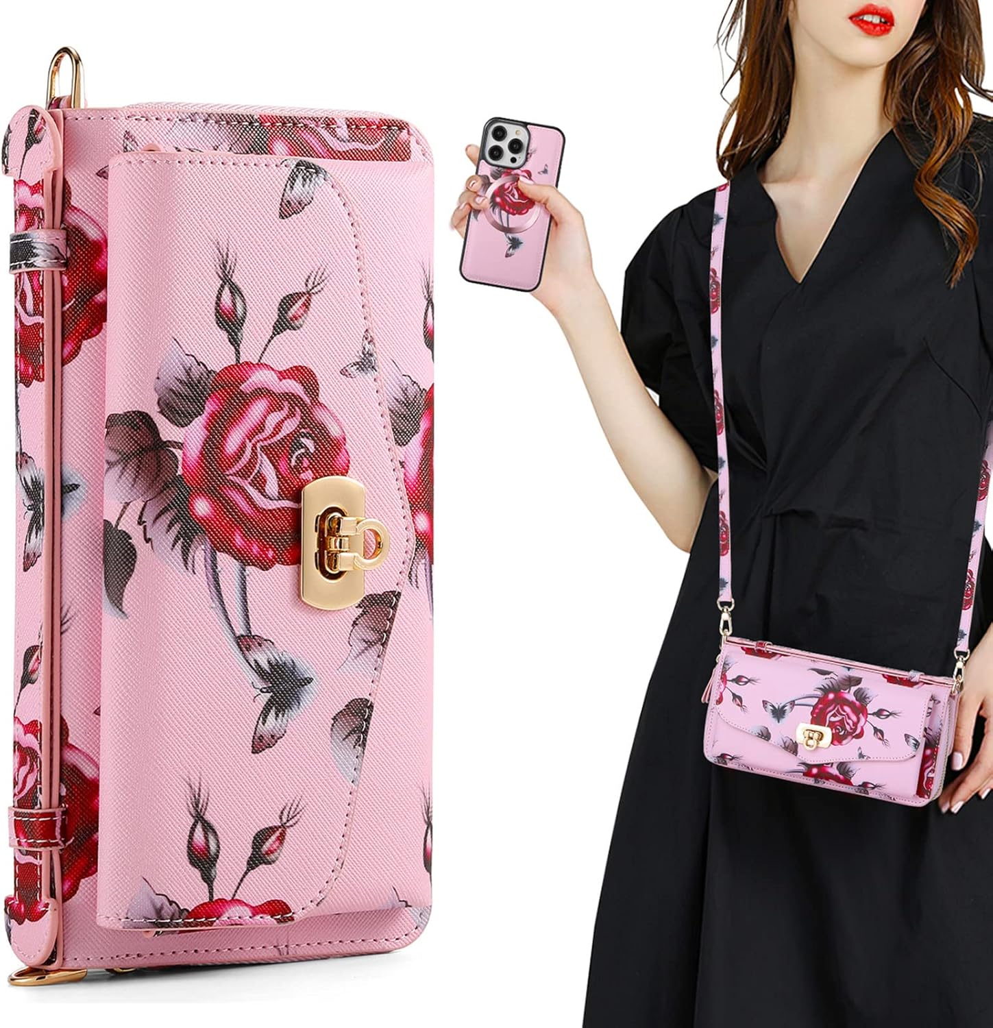 Do you want a case that's crossbodybag, handbag, clutch pouch, phone case, offers insane protection, and can take out independently? Then look no further than our Wallet Case ! 【Material】:Interior case flexible TPU High quality PU leatherAdvanced craftsmanship【Product Highlights】:✨ The all-in-one fashion zipper Wallet is all you need to carry your essentials. Comes with Zipper wallet, card slots, Money bill pocket, magnetic phone case.〓 The wallet and the mobile phone case are connected by a strong magnetic, you can take the mobile phone out of the wallet and use it alone, or you can use it together.🔋 This case has built in magnetic ring, compatible with Wireless Charging, providing you a more free charging experience.📶 The case is mold and test with real iPhone 14, key interface 1:1 Precise cutouts and snug fit, not obstruct the signal.⭐ 14 Card slots holder, multiple compartments to place cards, cash (No Fold),coin, photo, driver's license, VIP cards, etc.❃ Safe wallet - Zipper closure and Magnet buttons to make sure all things stay inside securely, and easy to open.🌸 Make it 5 ways carrying wallet: crossbody bag/shoulder purse/handbag/clutch/wristlet wallet.► The raised frame protects the camera and screen, speaker, camera more effectively.📦Package Contents📦 1 X Phone Case