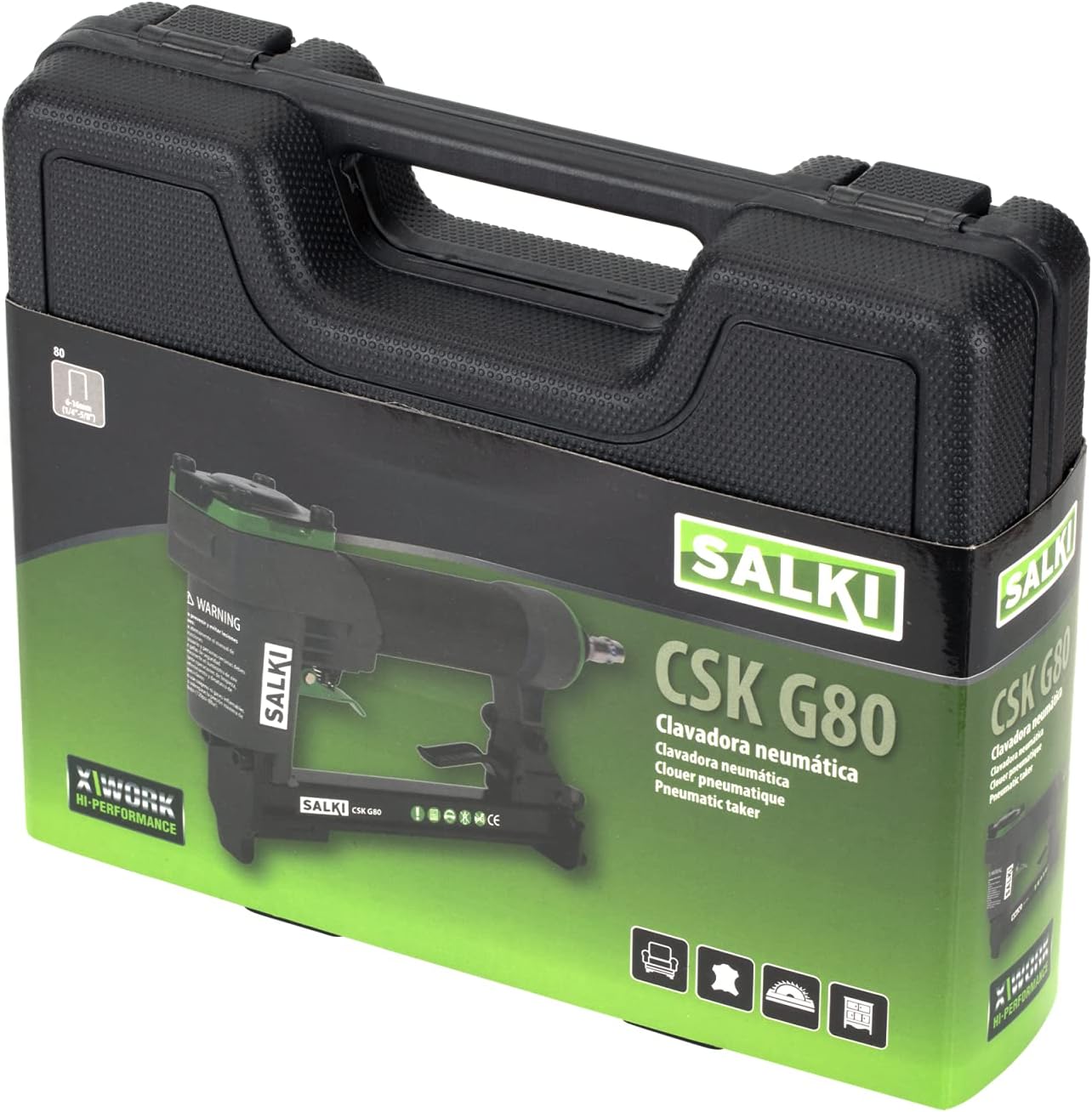 The SALKI CSK G80 Air Stapler is a robust and versatile tool designed for a variety of woodworking jobs. Its ergonomic appearance includes a trigger with safety system, an easy opening device and a side loader with display window for convenient use. Easy to use: load up to 140 staples into the side loader, remove the safety system and trigger the staples on the work surface. Made with a special anti-corrosion and anti-wear aluminum charger, this tool is durable and reliable. The pack also includes goggles, keys, grease for maintenance and a spare head, all in a convenient carrying case. This versatile tool is perfect for carpentry, cabinetmaking and DIY work, as well as for door installations, skirting boards and repairs. With its light weight, it is easy to carry and handle. Compatible with No.80 staples from 6 to 16 mm in length, it works with a pressure of 4 to 6 bar and has a universal 1/4" air inlet.