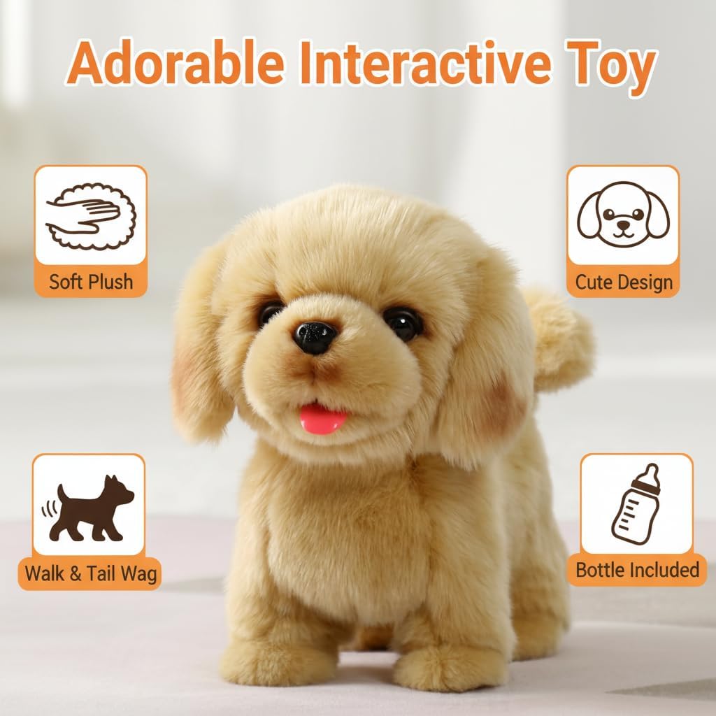 Bring joy and companionship into your home with this adorable interactive Golden Retriever puppy toy. This charming plush companion features incredibly soft, golden fur and lifelike details that make it irresistibly huggable. Watch as this electronic pet comes to life with realistic walking movements, tail wagging, and authentic barking sounds that create an engaging play experience. Perfect for children ages 3 and up, this interactive puppy helps develop nurturing skills and emotional bonds through imaginative play. The medium-sized design (approximately 8 inches long) makes it ideal for both cuddling and active play. Featuring bright, expressive eyes and a sweet smile, this puppy responds to interaction, encouraging hours of entertainment. The durable plush exterior ensures long-lasting enjoyment, while the interactive features make it an excellent alternative for families unable to have a real pet. Requires 3 AA batteries (not included) to activate all interactive features. This delightful robotic companion arrives ready to play in a retail box, making it an ideal gift for any young animal lover. The combination of soft, cuddly plush material and engaging electronic features creates a unique toy that's both comforting and entertaining.