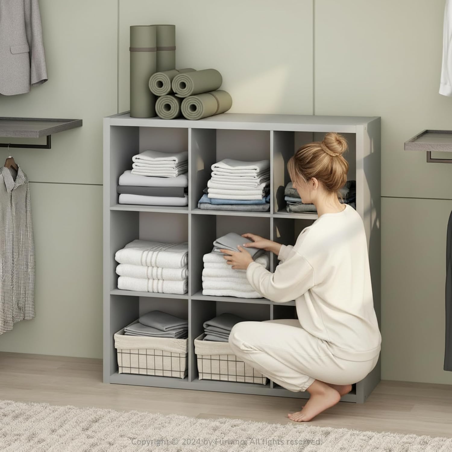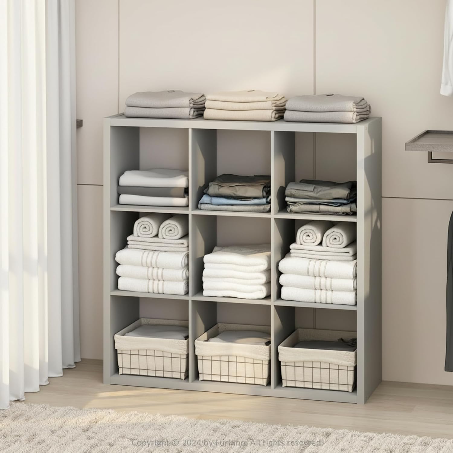 The Cubic Open Back Multipurpose Closet Storage Organizer Shelf is a stylish and practical solution for organizing clothing, shoes, accessories, and everyday essentials. Its open-back design ensures easy access and visibility, making it a versatile addition to closets, bedrooms, living rooms, or home offices. Featuring nine spacious cubes, this organizer allows you to customize your storage with bins or baskets to suit your needs. The 1.2-inch thick outer frame provides added strength and stability, while the Light Grey finish delivers a clean, modern aesthetic that complements a wide range of décor styles. Constructed from CARB-grade composite wood, this shelf is tested for durability and meets eco-conscious standards. Assembly is quick and straightforward with included instructions. Backed by a 1-year warranty against manufacturer defects, it offers dependable storage that fits your space and your budget.
