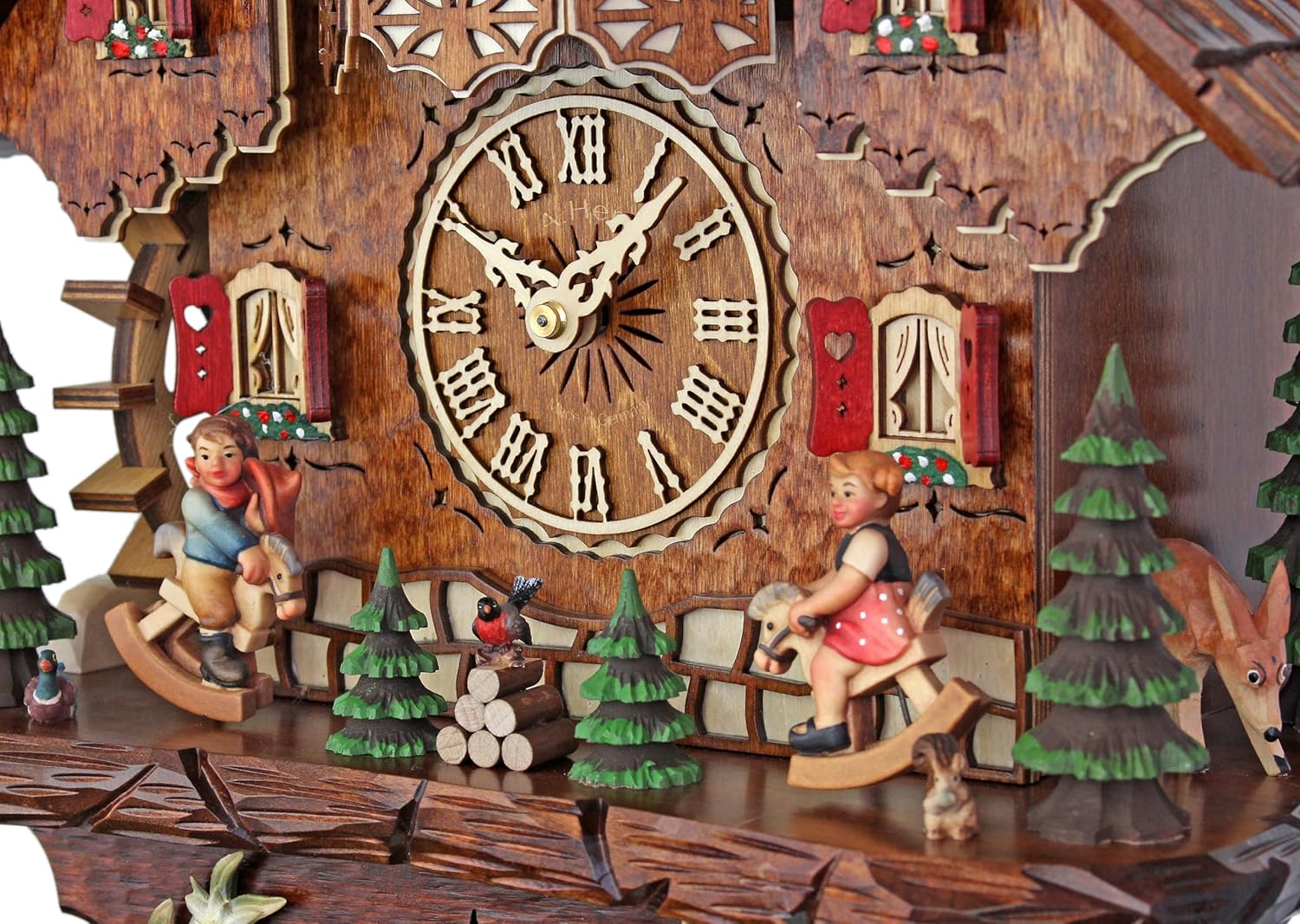 A cuckoo clock with a typical Black Forest House and a hand-carved shingled roof. The boy and girl rock merrily on their toy horses in time to the cuckoo call, which is once on the half hour and on the full hour according to the time. Two alternating melodies - Edelweiss and Happy Wanderer - play every hour while the water wheel turns and the figurines wearing the Black Forest costume dance around to the music. The clock is personally signed at the back by the manufacturer Adolf Herr . His signature guarantees the experience of 7 generations of clock-workmanship. This clock comes with a certificate of authenticity (AHC). Clock Movement: 8-Day(weekly wind-up) Regula rack strike movement with night off. Clock-Face: HerrZeit Wooden dial, diameter 4 Inch (10 cm), with wooden hands. Dancing Figurines: Handcarved and handpainted wooden couples in Black Forest costume. Pendulum: HerrZeit bolt pendulum with fine adjustment. Musical Movement: musical movment (22 tones) with two different melodies (Edelweiß & The Happy Wanderer). Chime: Diameter 12cm (4,7 ), burnished Cuckoo-Bird: HerrZeit cuckoo bird (handcarved). Color: walnut dark. Publication Year: 2010 Designer: Juergen Herr