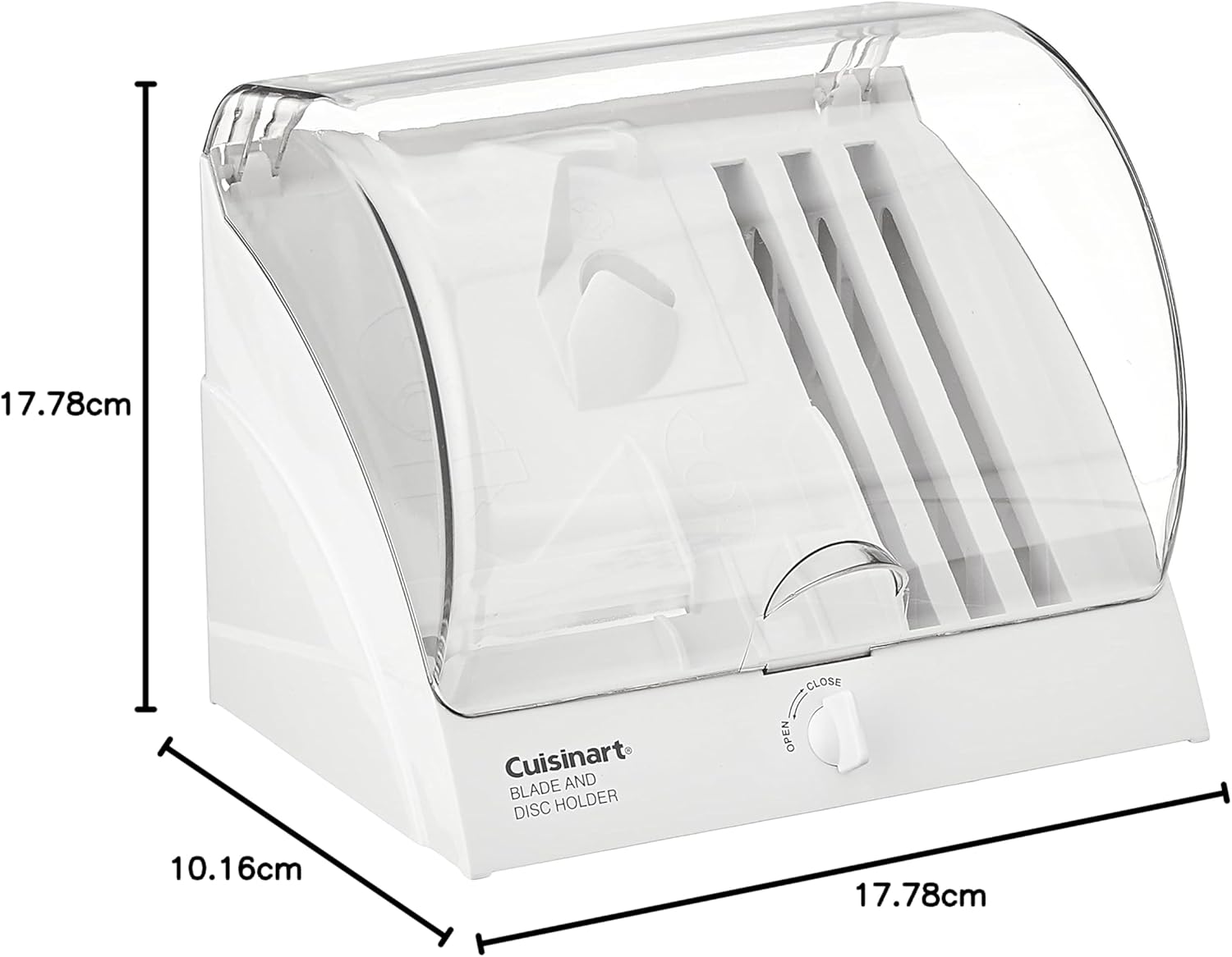 Product Description Keep your Cuisinart blades and disks safe and secure with the Cuisinart blade and disk holder. Constructed from high-impact plastic, this simple unit provides storage for three Cuisinart blades and three cutting disks. It is designed for use as a stand-alone storage or side by side with Cuisinart supplemental disk holder. The effective tamper-resistant locking device must be pulled out and twisted 90 degrees to access the cutting tools, and automatically relocks when the lid is closed. Also, since each blade holder is shaped to snugly fit Its designated blade, The cutting edge of each disk is completely protected. Amazon.com This simple unit provides safe, convenient, and attractive countertop storage for three Cuisinart blades and three cutting disks. It's designed to be used as stand-alone storage or side by side with Cuisinart's supplemental disk holder. The effective tamper-resistant locking device must be pulled out and twisted 90 degrees to access the cutting tools, and it automatically relocks when the lid is closed. Blades cannot be accessed via the open bottom, and disks can only be removed through the locking top. Moreover, when all three storage slots are occupied, the cutting edges of each disk are completely protected. Each blade holder is shaped to snugly fit its designated blade. High-impact plastic and external surfaces are smooth and curved to facilitate cleaning. --Toni Reineke
