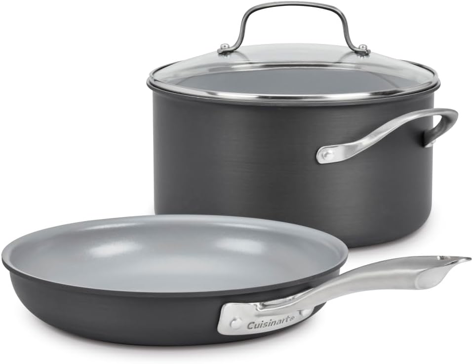 The GreenGourmet™ Complete set is crafted from 100% post-consumer recycled materials, with durable hard anodized construction, using over 250 recycled soda cans. It features Cuisinart’s exclusive PURELYCERAMIC™ Nonstick Advanced Release System, which is free of PFAS, PFOS, PFOA, and petroleum, ensuring easy food release and allowing for cooking with less oil and butter. The stainless steel handles, made from 70% recycled material, stay cool on the stovetop. Designed for professional results, the cookware is perfect for simmering, sautéing, and searing, and its fast, energy-efficient heating makes it suitable for all stovetops, including induction. Set includes: 1.5 Qt. saucepan with cover, 2.5 Qt. saucepan with cover, 3 Qt. saute pan with helper handle and cover, 6 Qt. stockpot with cover, 8" skillet, 10" skillet, 18cm universal steamer.