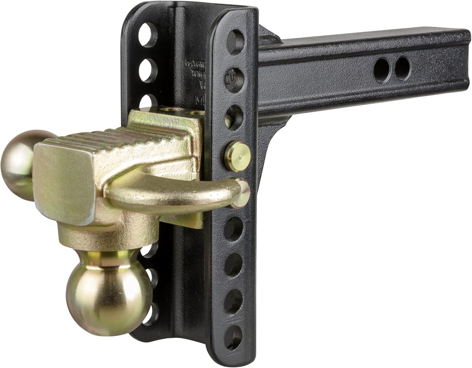 If you own multiple trailers or frequently tow a variety of loads, you know how much time and money are spent tailoring your towing system to each and every individual trailer. There is nothing more inconvenient than switching back and forth between a few different ball mounts and trying to remember which mount fits with which trailer. A CURT adjustable ball mount is your multipurpose towing solution. This CURT adjustable channel-style ball mount has a shank size of 2" x 2" and features a multipurpose head with two different trailer ball sizes to accommodate two different coupler sizes: 2" and 2-5/16". It also features a hitch step for easier truck bed access, as well as a tow hook for straight-line pull applications (max tow hook capacity is 10,000 lbs.; DO NOT EXCEED TRAILER HITCH CAPACITY). The head attaches to an adjustable shank assembly with multiple mounting holes for varying ball heights. Each trailer ball can be raised to a maximum of 5-1/4" rise or lowered to a maximum of 6" drop, allowing you to make your trailer completely level in any towing situation. The channel-style design and dual-pin mounting system also provide a built-in anti-rattle feature to eliminate obnoxious chucking noises. This CURT adjustable ball mount offers a gross trailer weight capacity of up to 10,000 lbs. for the 2" ball and 14,000 lbs. for the 2-5/16" ball. It allows you to tow a variety of heavyweight trailers, and it features two pin holes in the shank to be mounted at an 11" or 12" length. All CURT channel-style adjustable ball mounts are made with sturdy steel construction and come with our black carbide powder coat finish for long-lasting rust, scratch and UV resistance. This product is protected under U.S. Patent Numbers: 11,628,698 and 11,660,916.