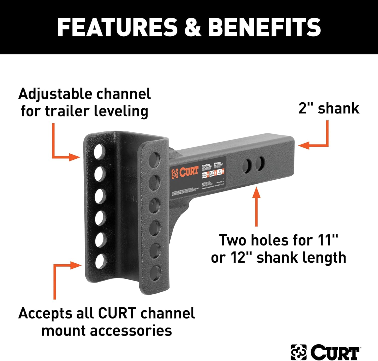 This replacement shank is designed to fit the CURT adjustable channel mount #45901. It has a 2-inch x 2-inch shank and multiple holes for versatile height adjustment of the attachment. NOTE: This package includes the shank only. Attachment sold separately.