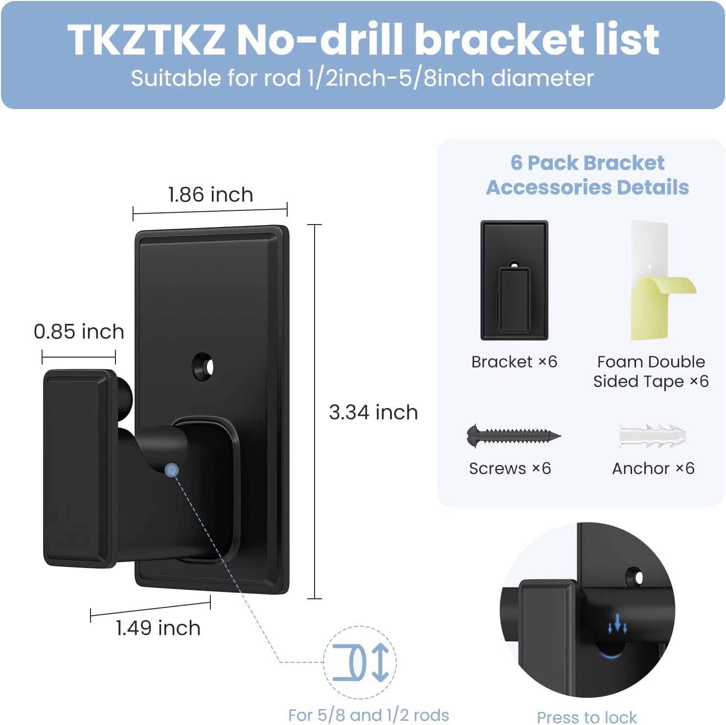 【Pro-Level Bundle: The Ultimate Double-Bracket Curtain Solution】 Maximize your window styling options with the TKZTKZ Curtain Rod and Multi-Function Bracket Bundle. This high-value combination pairs our sturdy durable curtain rod (including original heavy duty iron brackets) with an additional set of no drill curtain rod brackets. It’s the definitive combo for users who require both the rock-solid reliability of a screw mount and the renter-friendly convenience of a no damage wall setup. 【Double the Hardware, Double the Stability】 Bundle Components: 1x Complete Curtain Rod Set (with Iron Brackets) + 1x Multi-Function Bracket Set (Adhesive & Screw compatible). Premium Materials: 100% all-metal rod with 0.8mm thickness—designed for heavy duty performance. Universal Fit: Both sets of brackets are precision-matched for 5/8 inch poles, ensuring a gap-free, stable window treatment experience. Aesthetic Finish: Rust-resistant Matte Black coating provides a modern, decorative look. 【Adaptive Design for Every Living Space】 This bundle is engineered to adapt to any wall type—from smooth tiles in the bathroom to painted drywall in the living room. Utilize the extra adhesive wall hooks for a no drilling install (perfect for dorms or apartments), or engage the permanent screw metal brackets for maximum 30LB weight capacity. The adjustable curtain rod fits windows, making it versatile for the kitchen, bedroom, or RV. 【Service: The TKZTKZ Promise】 Our bundle is more than just a product; it’s a commitment to your satisfaction. TKZTKZ stands by our quality service, ensuring every window hardware rod holder meets the highest standards of innovation and reliability.