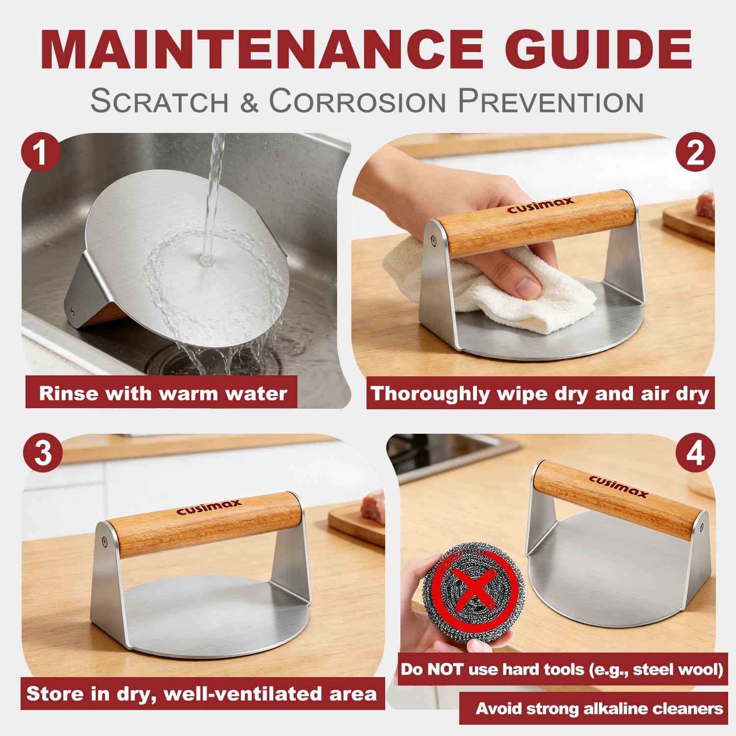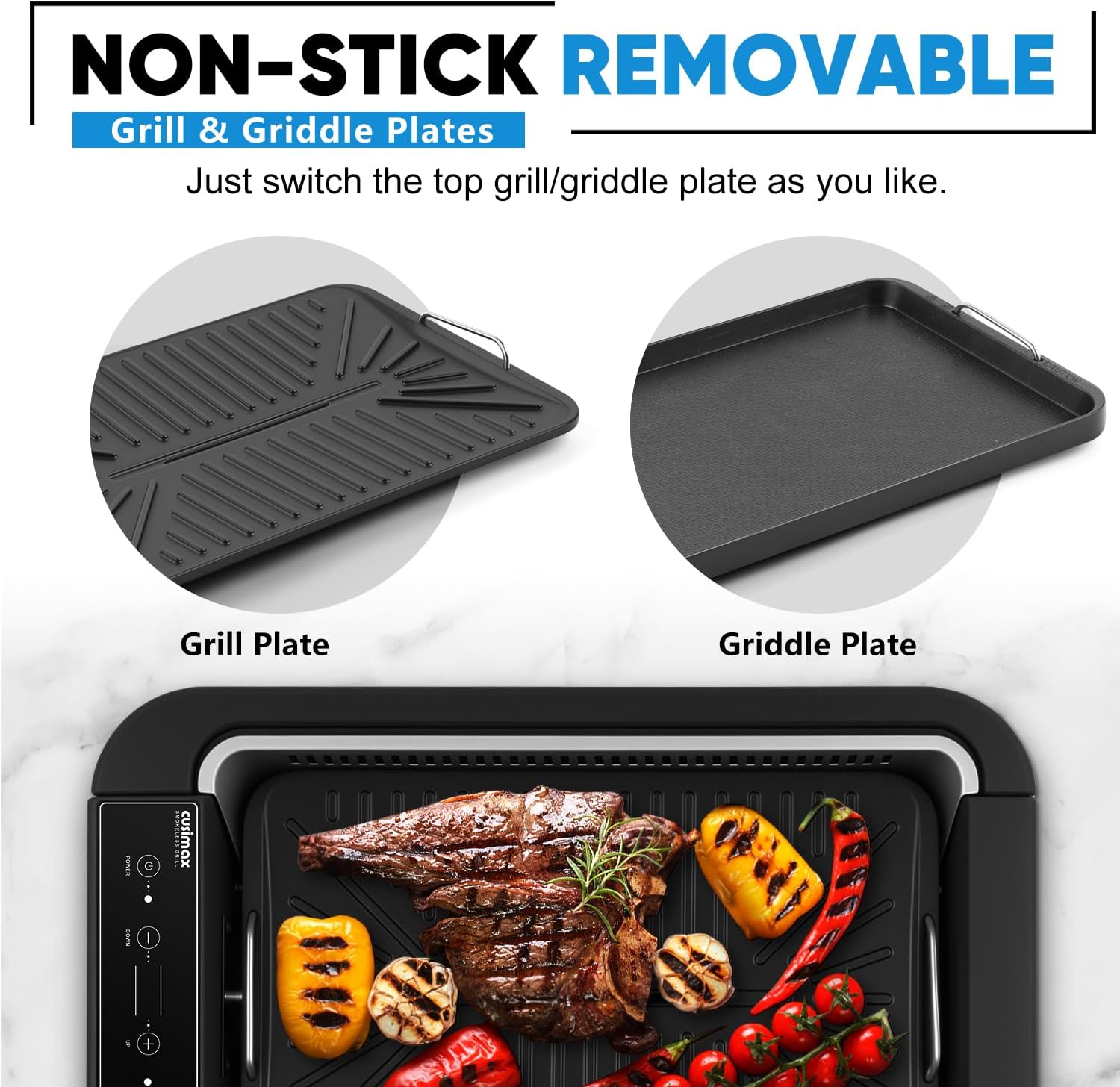 Cusimax indoor grill is equipped with double U heating tubes with a power of 1500 watts, reaches maximum temperature in minutes and provides fast, stable heating for your food. Paired with a stainless steel burger press, it can easily make delicious burgers, bacon, and more.