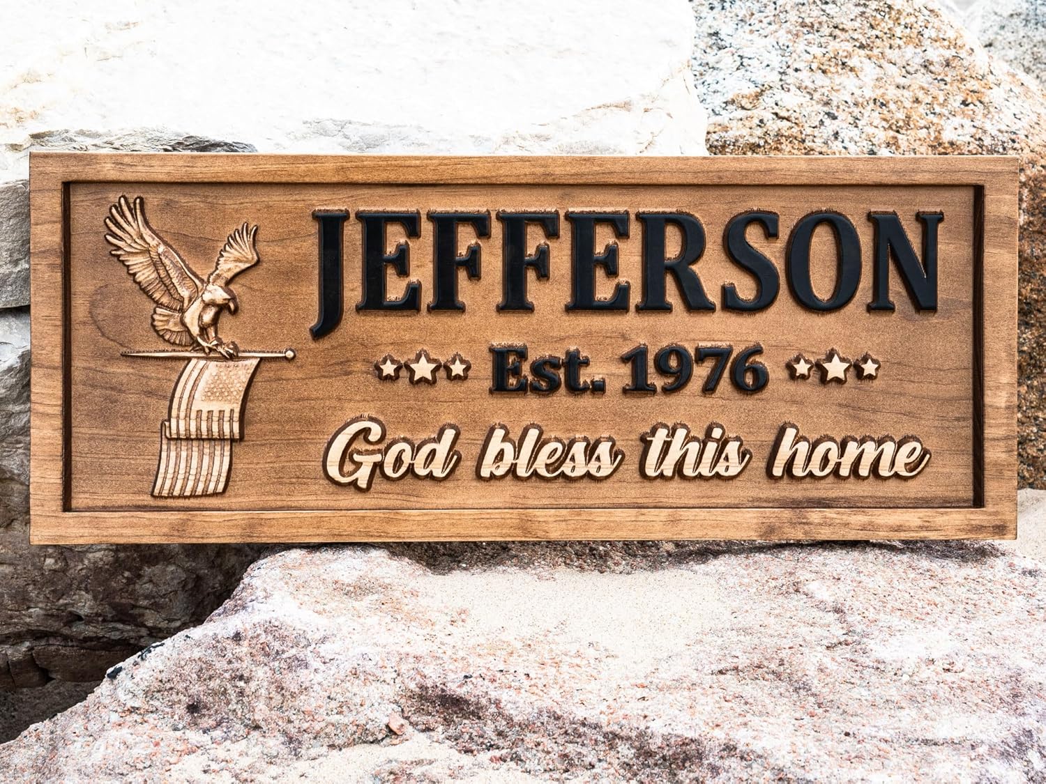 You're looking at a personalized wood sign carved from 3/4" premium quality solid pine and made using two-tone stain that's finished with sealer. Each sign is designed with your custom text in the layout shown and comes equipped with a sawtooth hanger for effortless hanging. Notice the 3D lettering and images that pop out from the background; Natural characteristics of the wood are showcased in each piece. The knots and wood grain vary from piece to piece and are not considered a flaw or defect in the sign. It simply shows the natural characteristics within the wood. We do not recommend placing outdoors in the direct elements. Exposure to moisture, sun, and wind will cause damage over time. If using outdoors, protection from elements is strongly recommended. Long-term outdoor use is at the buyer’s risk. Signs damaged from outdoor exposure are not eligible for returns, refunds, or replacements. Message seller if you have any questions or special requests. Thank you!